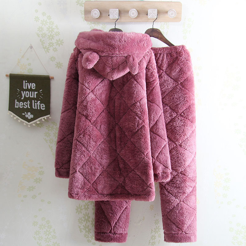 Winter three-layer thickened quilted hooded mid-length women's pajamas Korean style casual plus velvet warm personalized home service