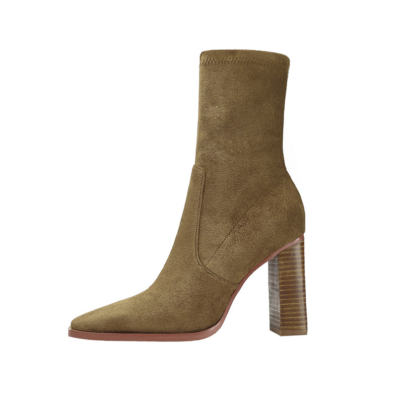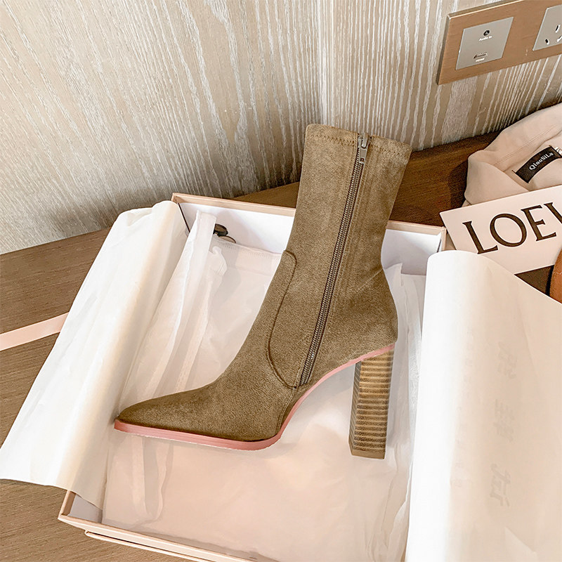 2021 new European and American short boots female square head coarse heel super high heel shoe side laced elastic boot slim slim boot with its color boot