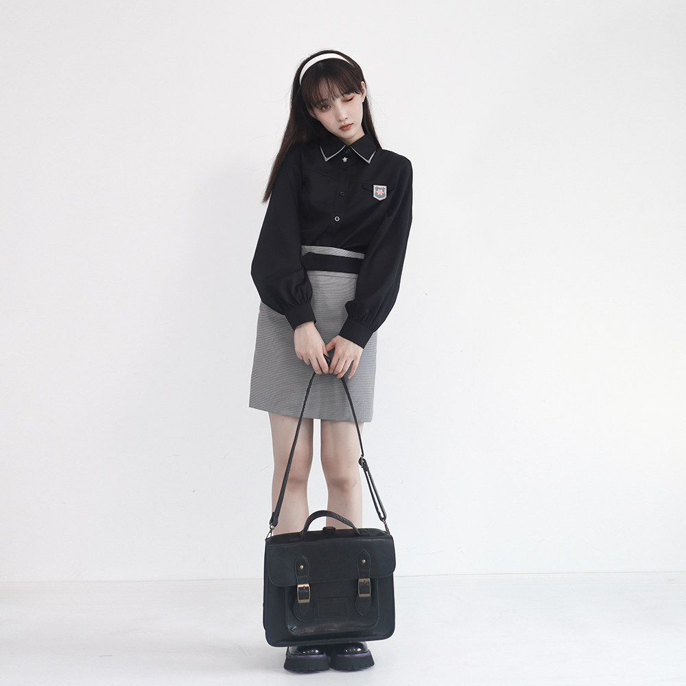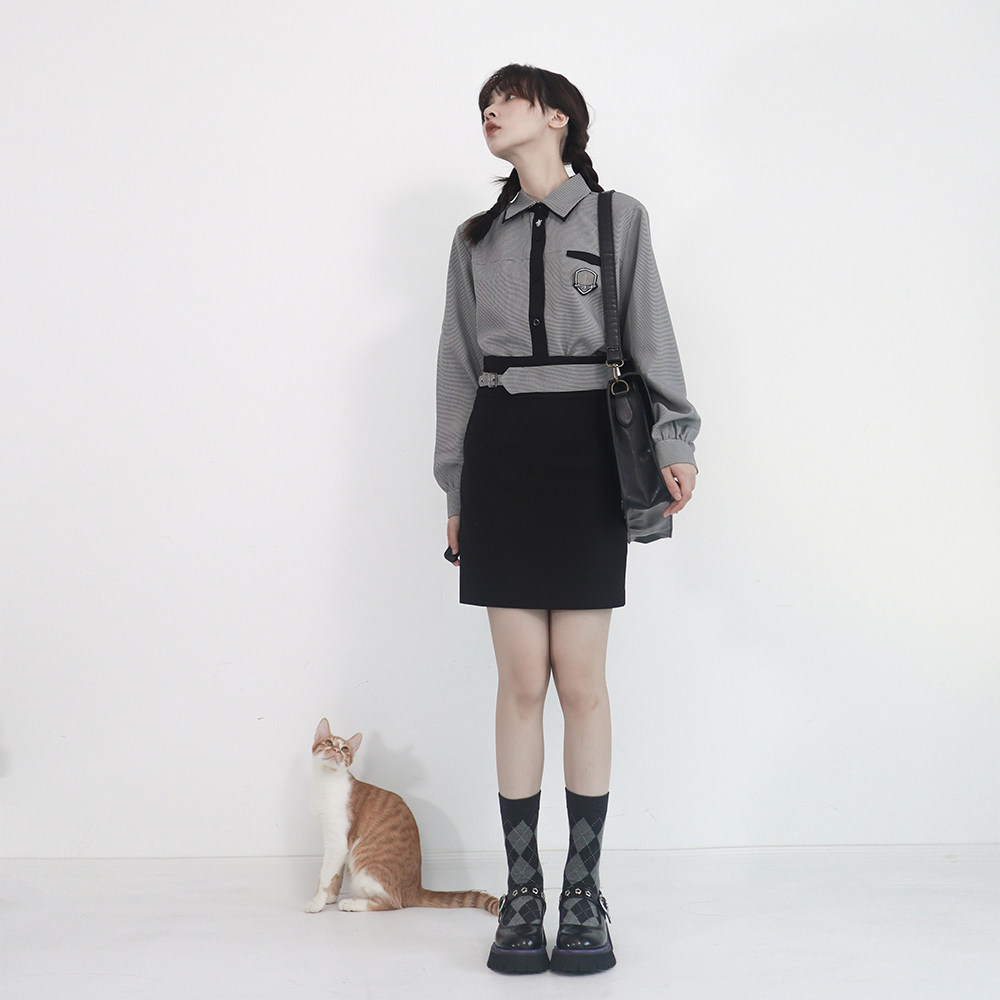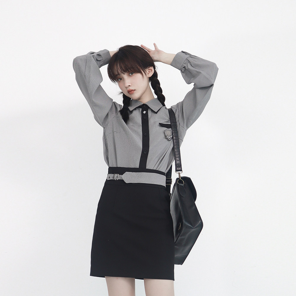 Houndstooth Shirt Long Sleeve Free Badge Houndstooth Hip Skirt Black Shirt Long Sleeve Free Badge Black Hip Skirt