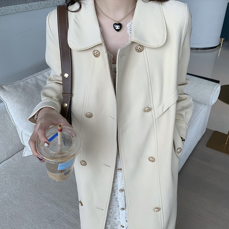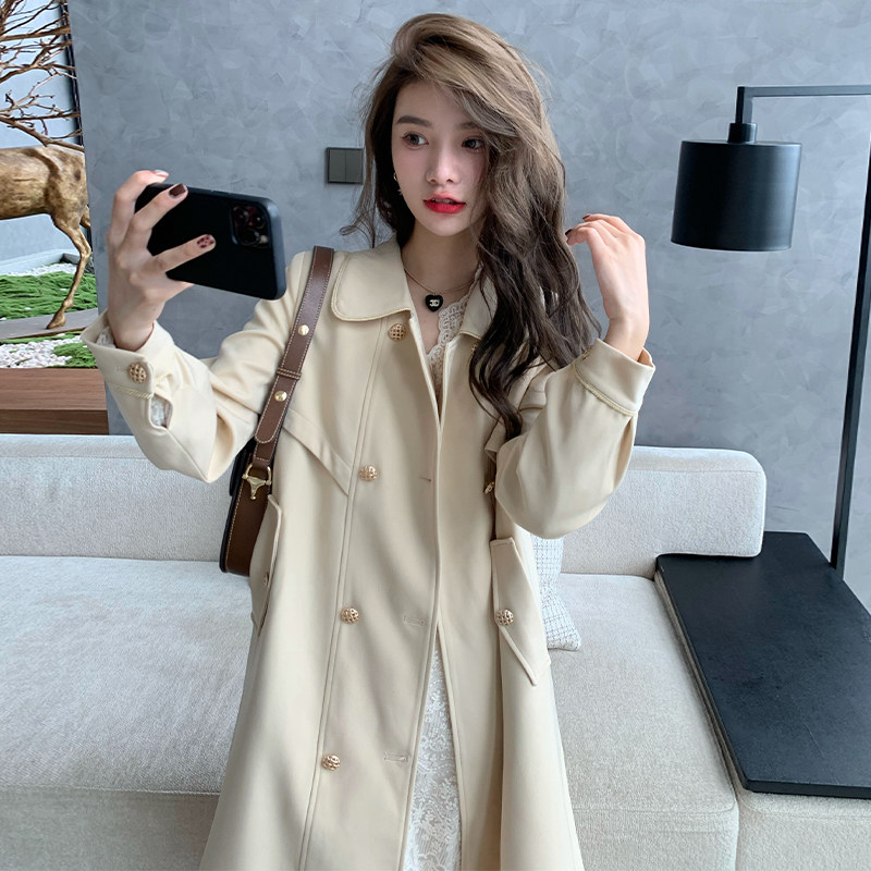 Deng Liuliu Korean version loose mid-length windbreaker femininity slimming retro horseshoe buckle cheese color over-the-knee coat