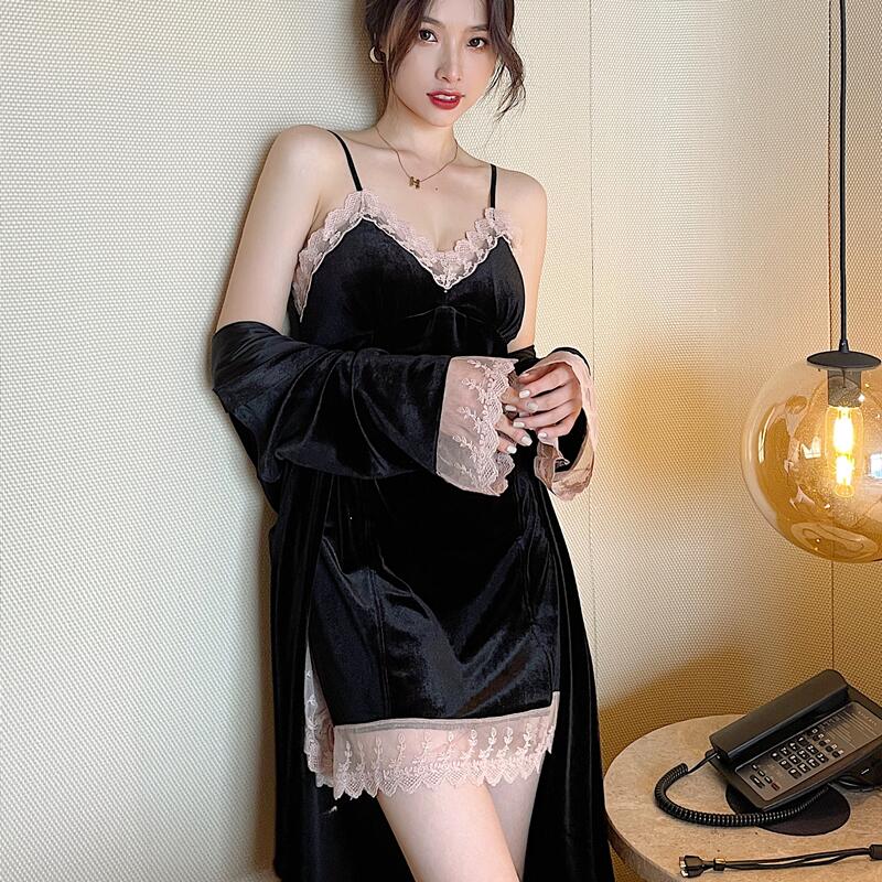 Sexy pajamas with chest pads women's autumn and winter 2021 gold velvet nightgown long-sleeved two-piece lace suspender nightdress women