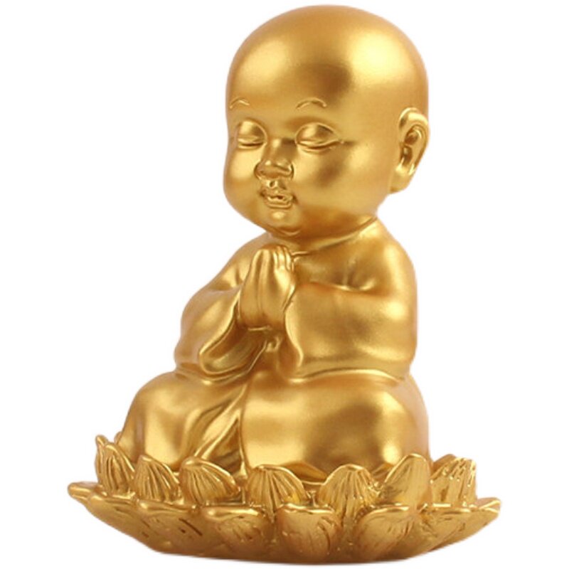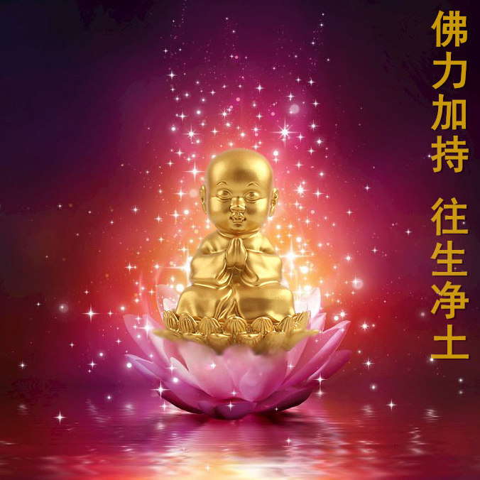 The little monk and the boy worship the auspicious ornaments, the clean lotus, the boy, the Buddha statue