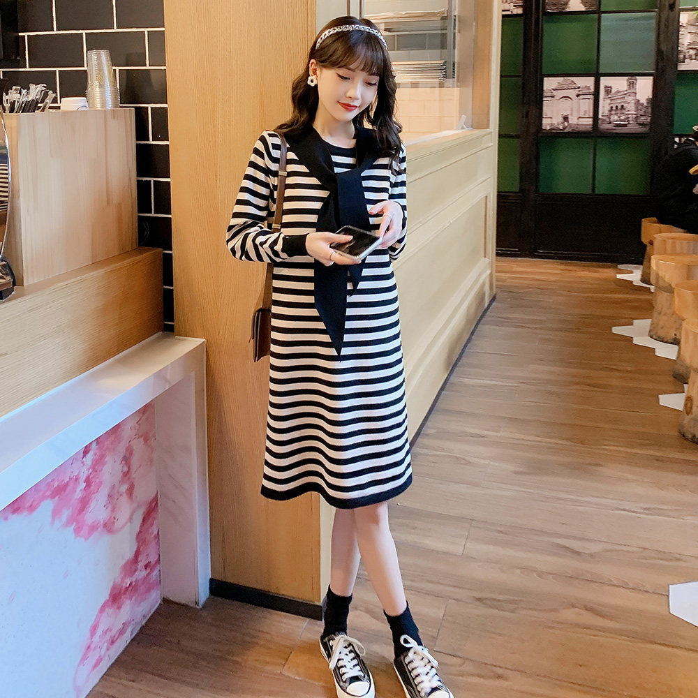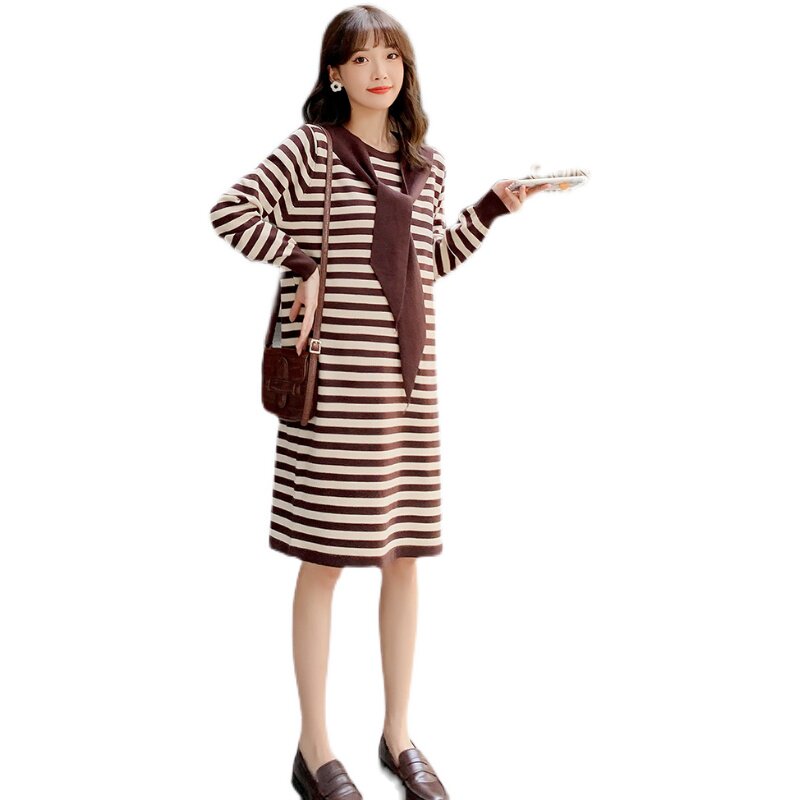 Pregnancy Woman Dress Autumn Winter Sweater Fashion style Dress Striped Jacket Head Long Dress Loose Knit Long Sleeve Skirt Winter Dress Woman