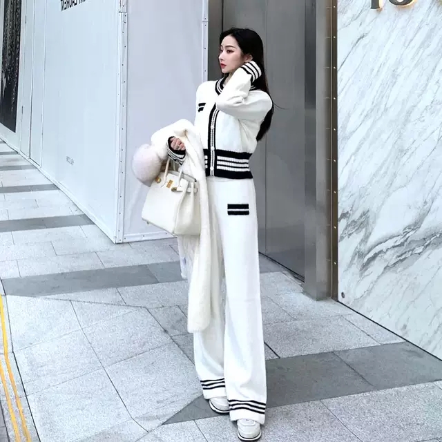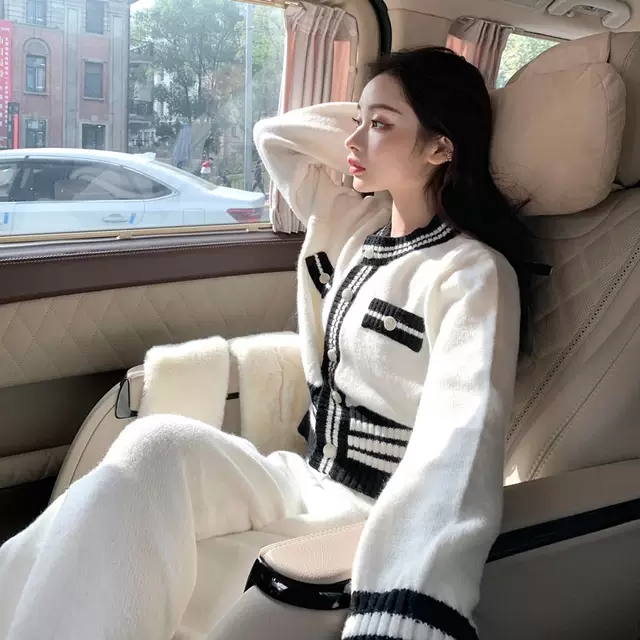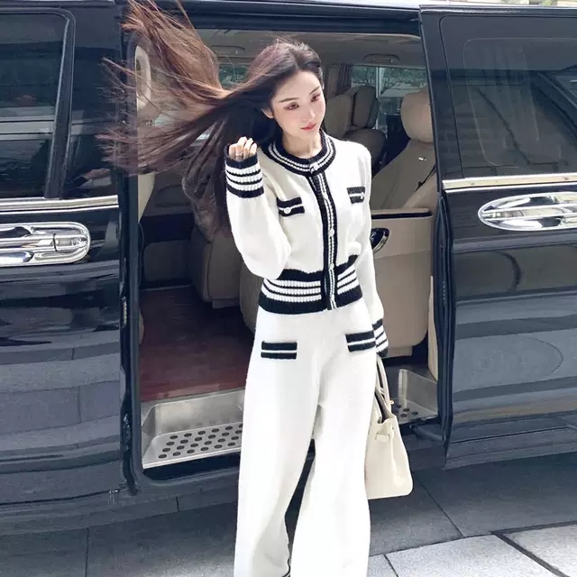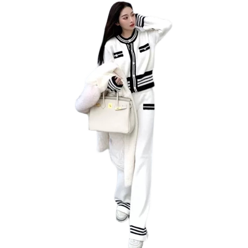Sports and leisure suit women's 2021 spring and autumn new ladies temperament long-sleeved knitted sweater wide-leg pants two-piece set women