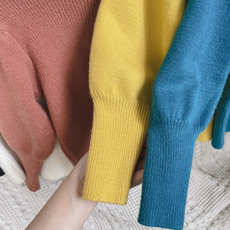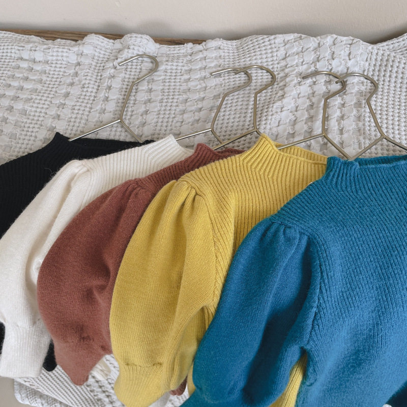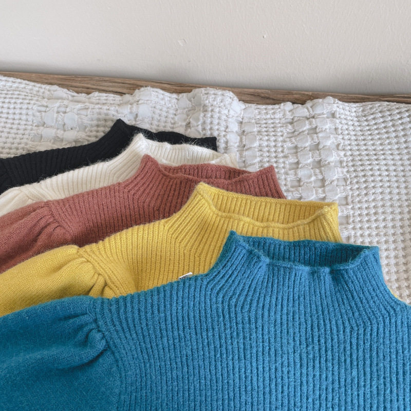 Girls' bottoming sweater autumn and winter Korean version of children's solid color knitted pullover girl treasure puff sleeve turtleneck sweater top