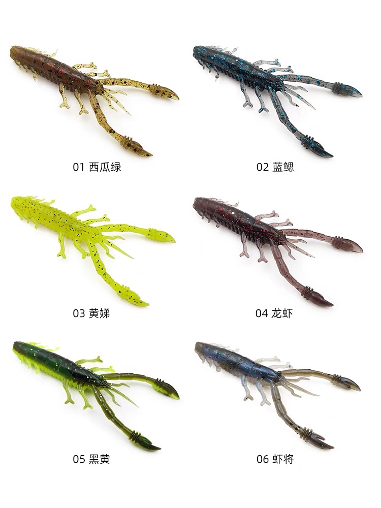 1#Watermelon green 2 2 inches 2#Blue gill 2 2 inches 3#Huang Di double color 2 2 inches 4#Lobster 2 2 inches 5#Black and yellow double color 2 2 inches 6#Shrimp double color 2 2 inches 1#Watermelon green
