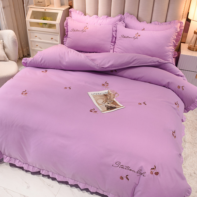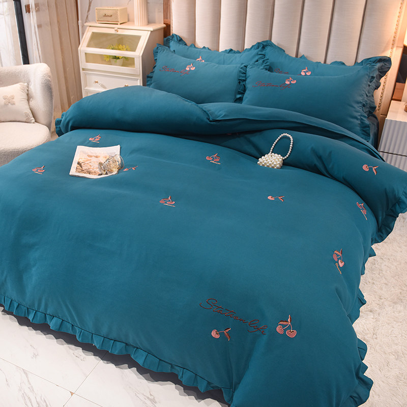 Sleeping net red four pieces of pure cotton cotton light luxury embroidered pure color by bed skirt bed with simple princess wind bed cover