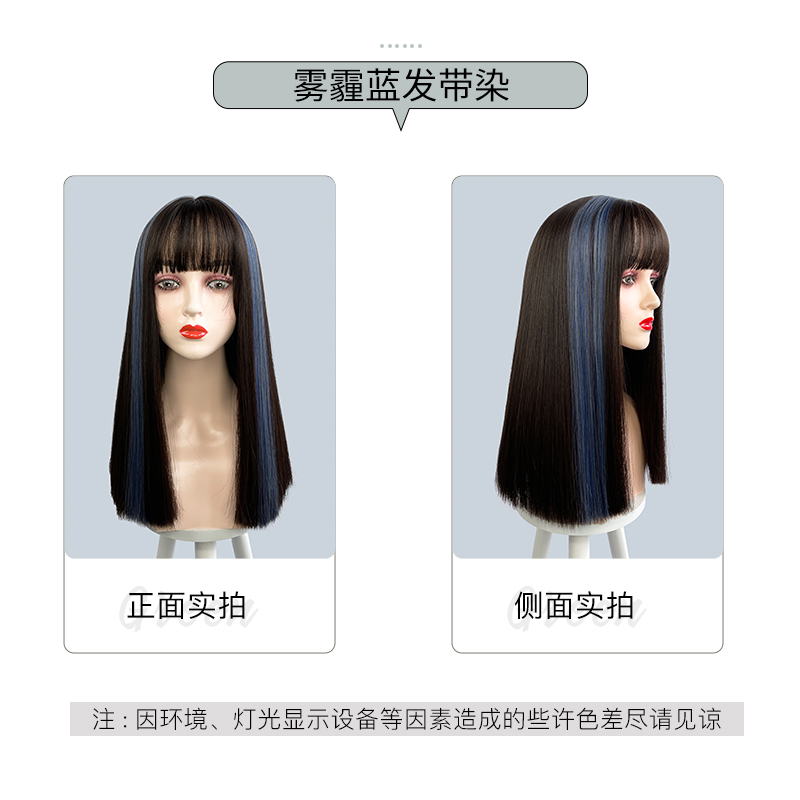 Wig woman long hair headgear net red Qi and sea personality Color smog blue hair with dyeing medium long straight hair wig cover