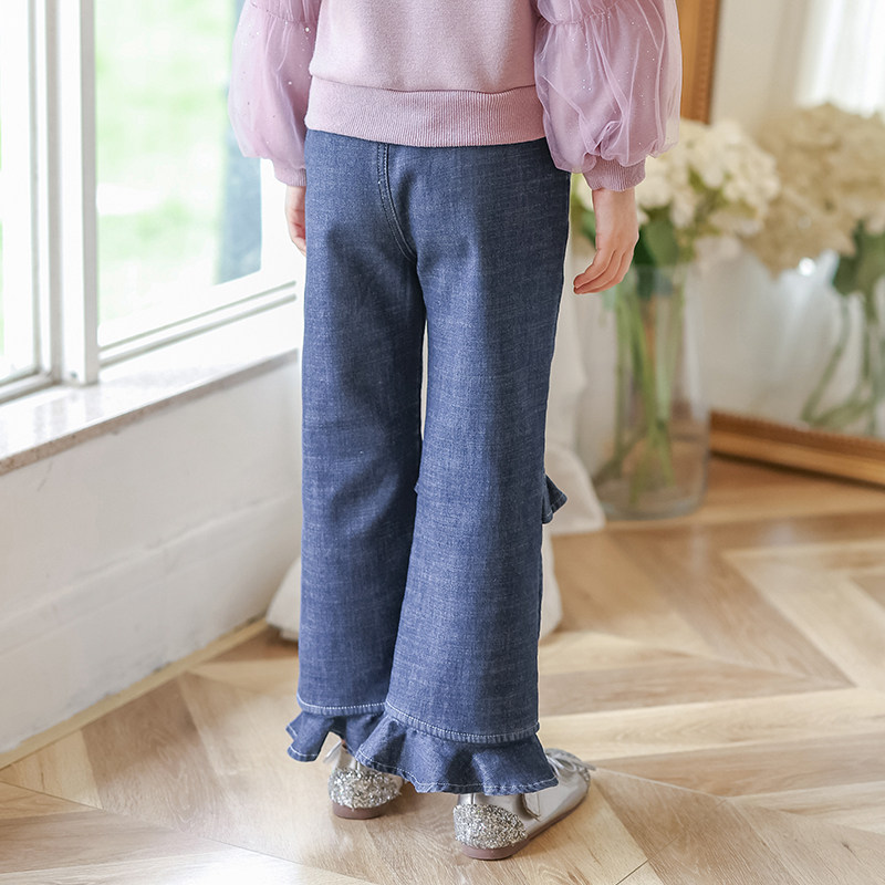 Boat mouse girls fleece jeans autumn and winter thickened straight ruffles little girl pants big boy children's trousers
