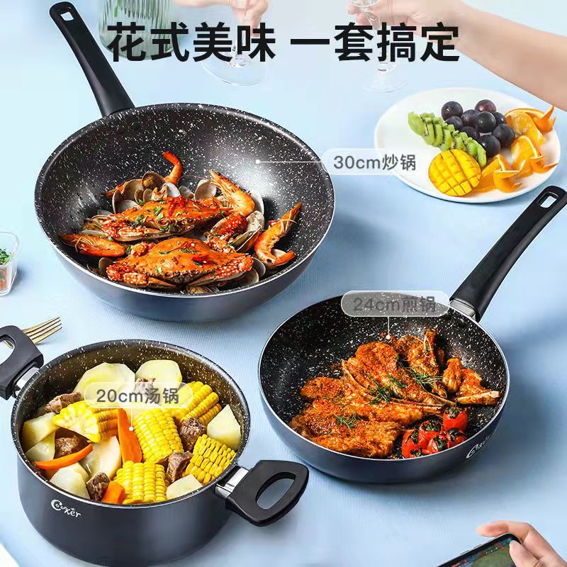The Eshida doesn't stick to the pot suit Three sets of wok combined frying pan frying pan gas stove Ming fire special