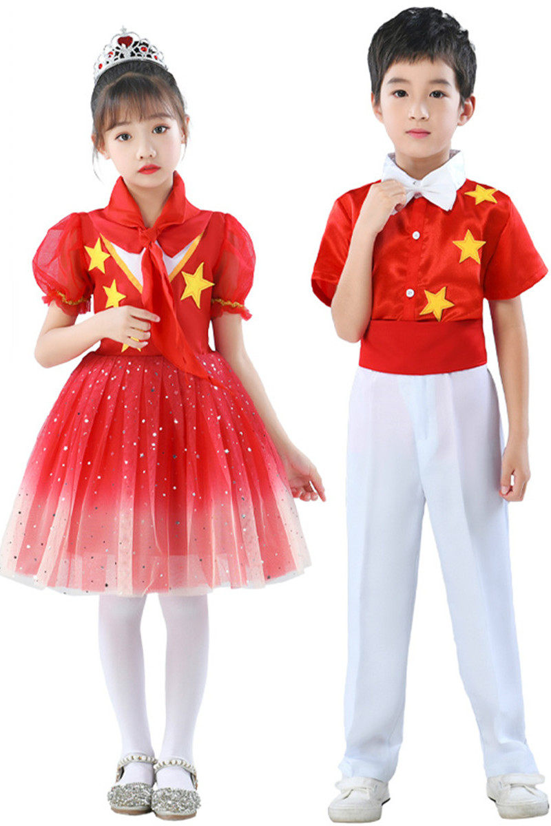 New red song children's chorus performance clothes primary and secondary school students poetry recitation red star sparkling dance performance clothes gauze skirt