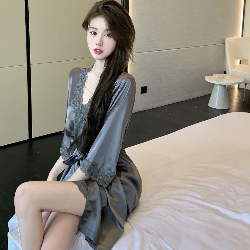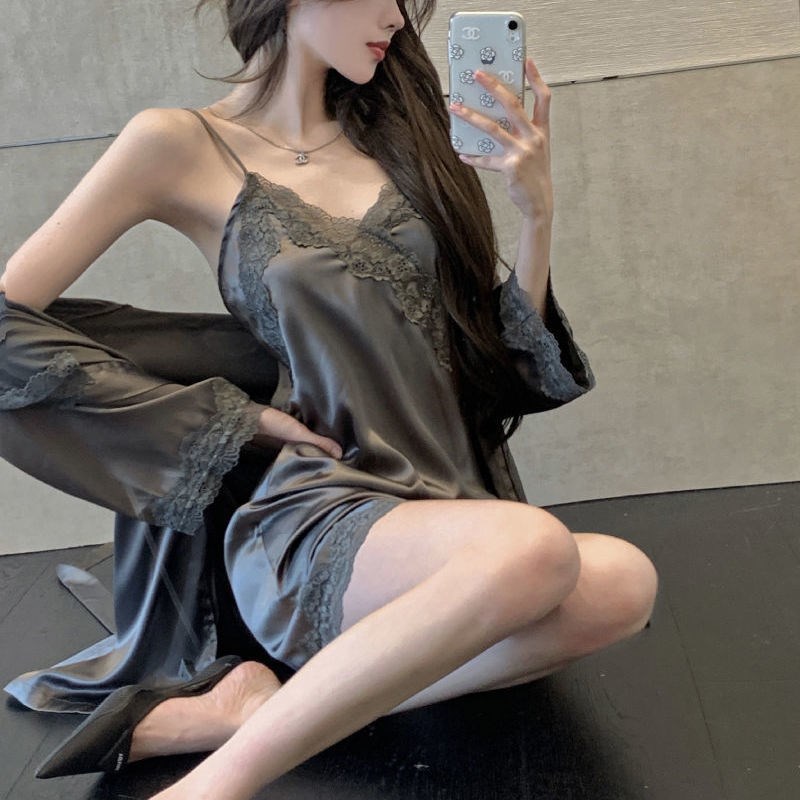Lace ice-like silky silky nightgown home clothes summer thin style satin suspenders satin suspenders two-piece autumn