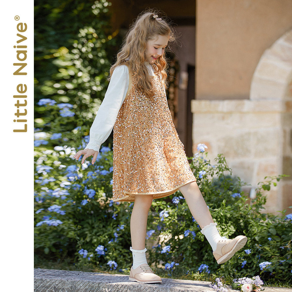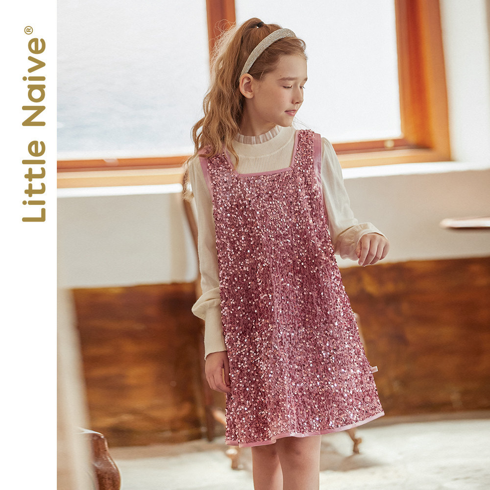 LittleNaive autumn and winter models velvet sequins girls vest skirt big children's one-year-old red foreign style dress
