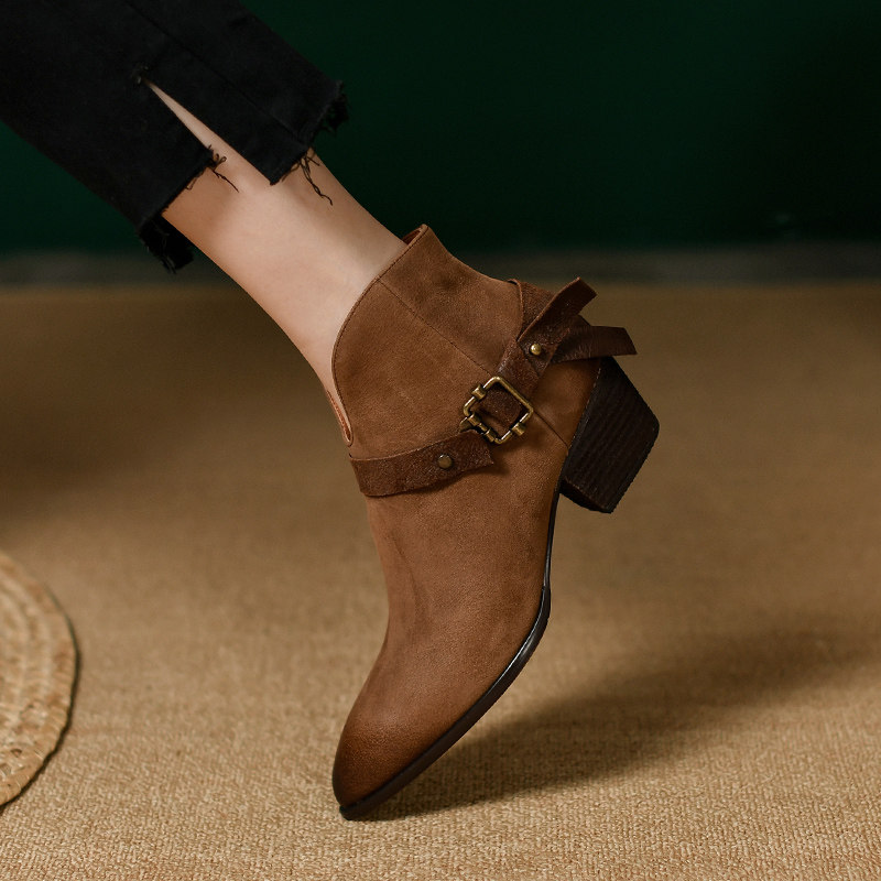 Yingren Wind Fried Street Small Short Boots Woman Spring Autumn Single Boots Woman Heel Pointed Coarse Heel Retro Brown Genuine Leather Ankle Boots Woman