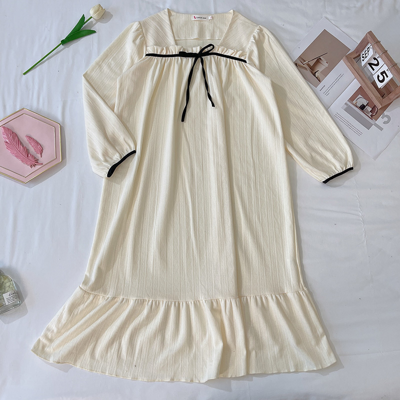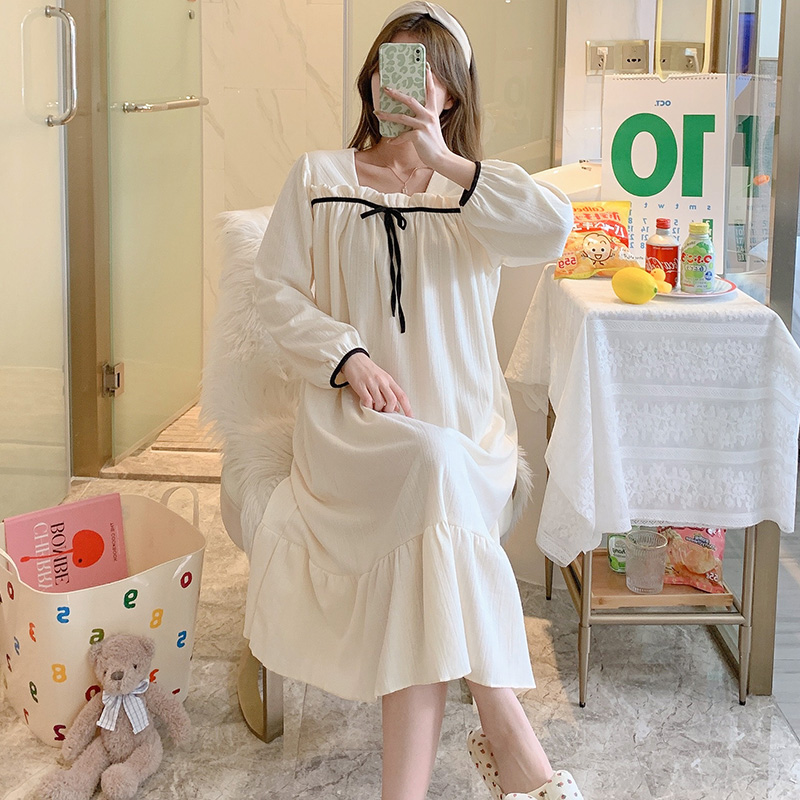 Sleeping Dress Lady Spring Autumn Season Princess Wind Long Sleeve Pure Cotton Cute home clothes pure color net red popcorn Sleeping Clothes Woman can be worn outside