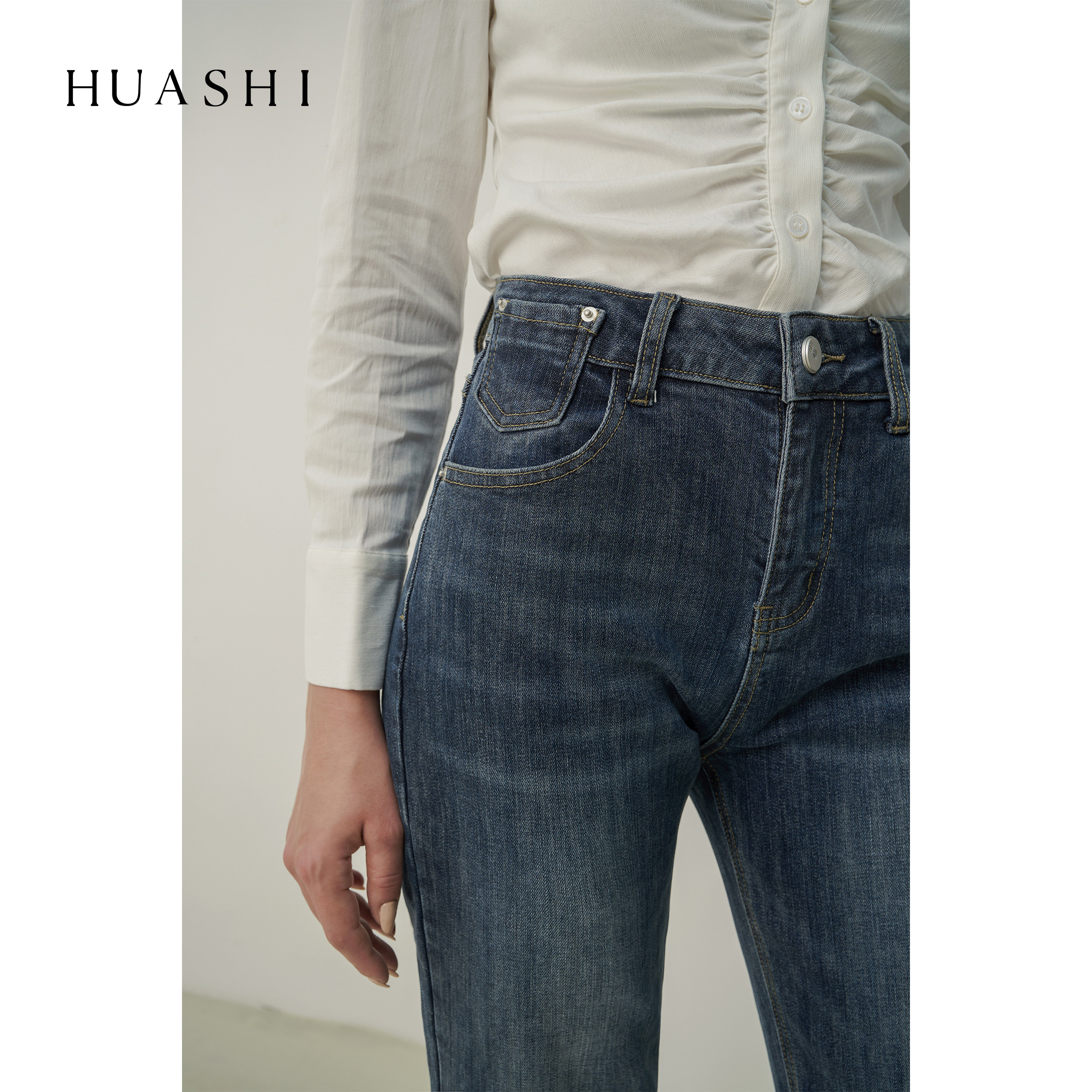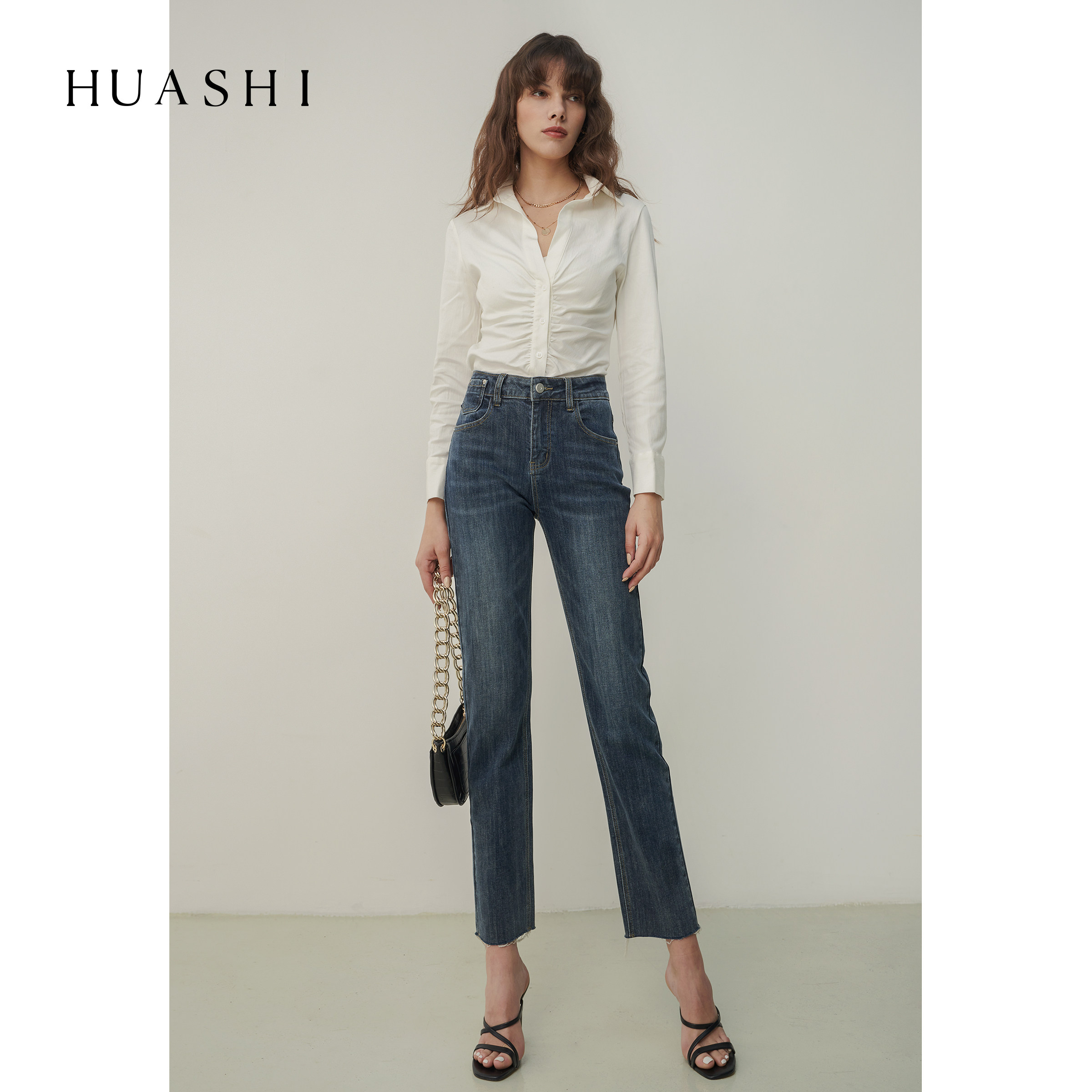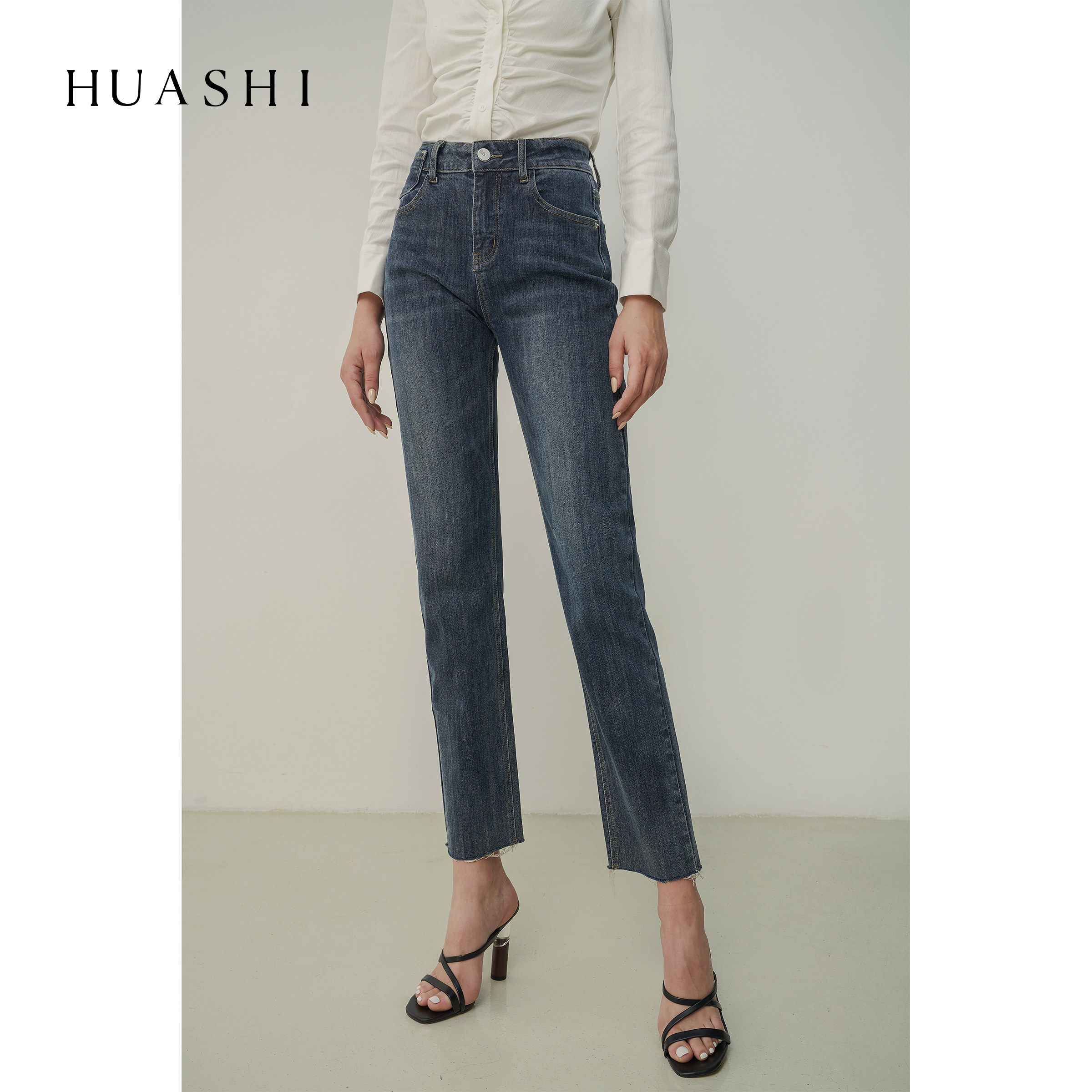 HUASHI blue-gray high-quality straight-leg jeans women show thin legs and straight raw edges design sense nine-point pants women