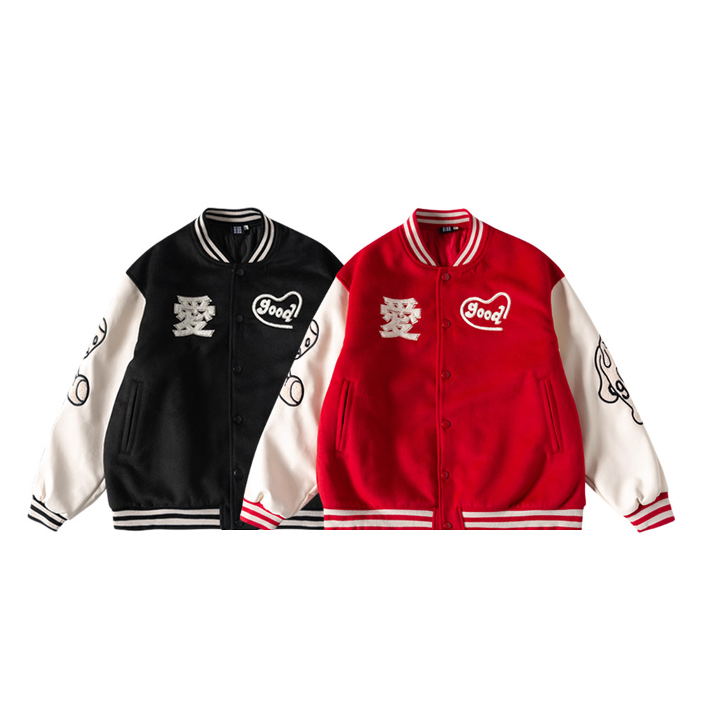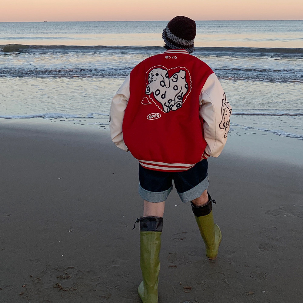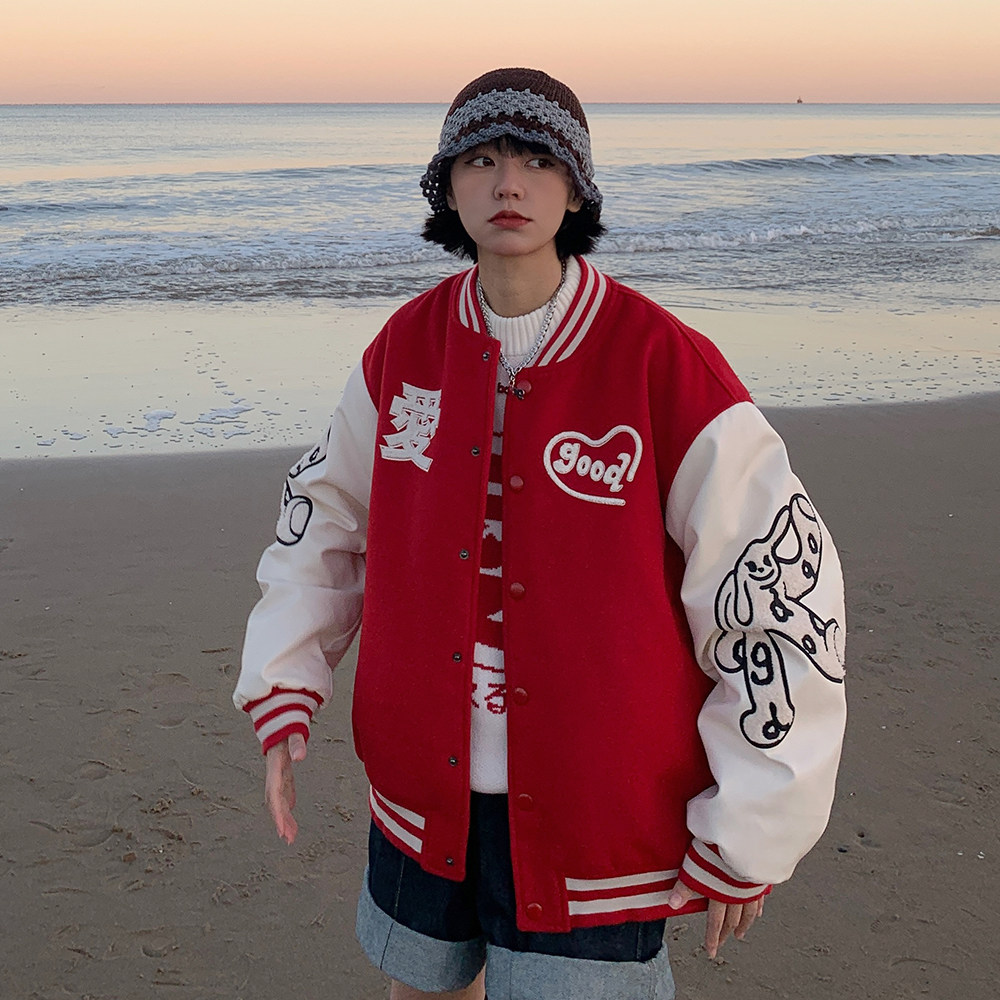 Nice store MeihaoStore love word Rabbit dog embroidered cotton thickened baseball pu leather splicing couple jacket