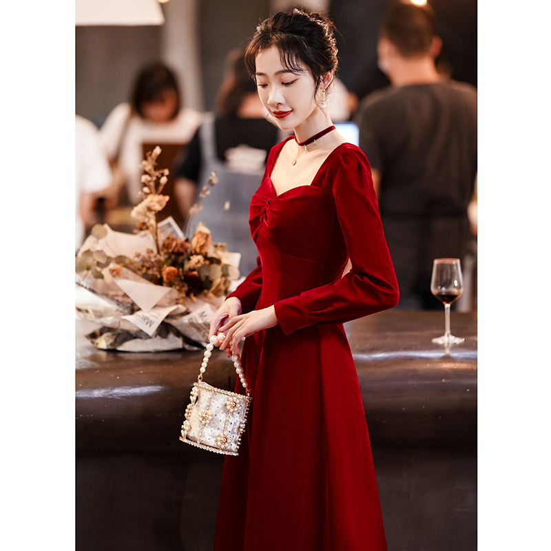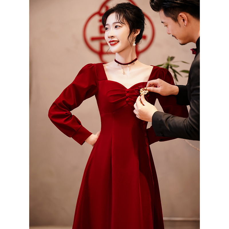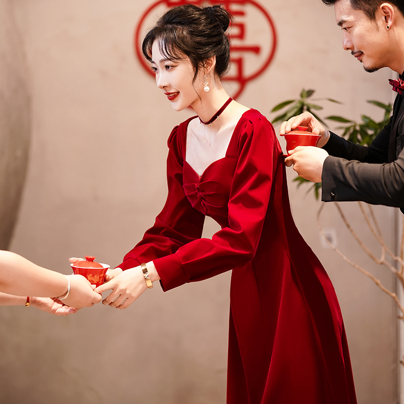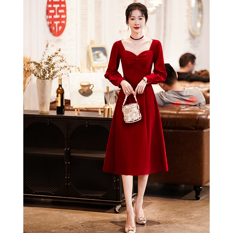 Velvet long sleeve toast bride autumn winter little engagement dress red home dress can be weared