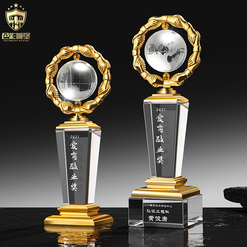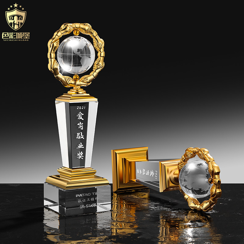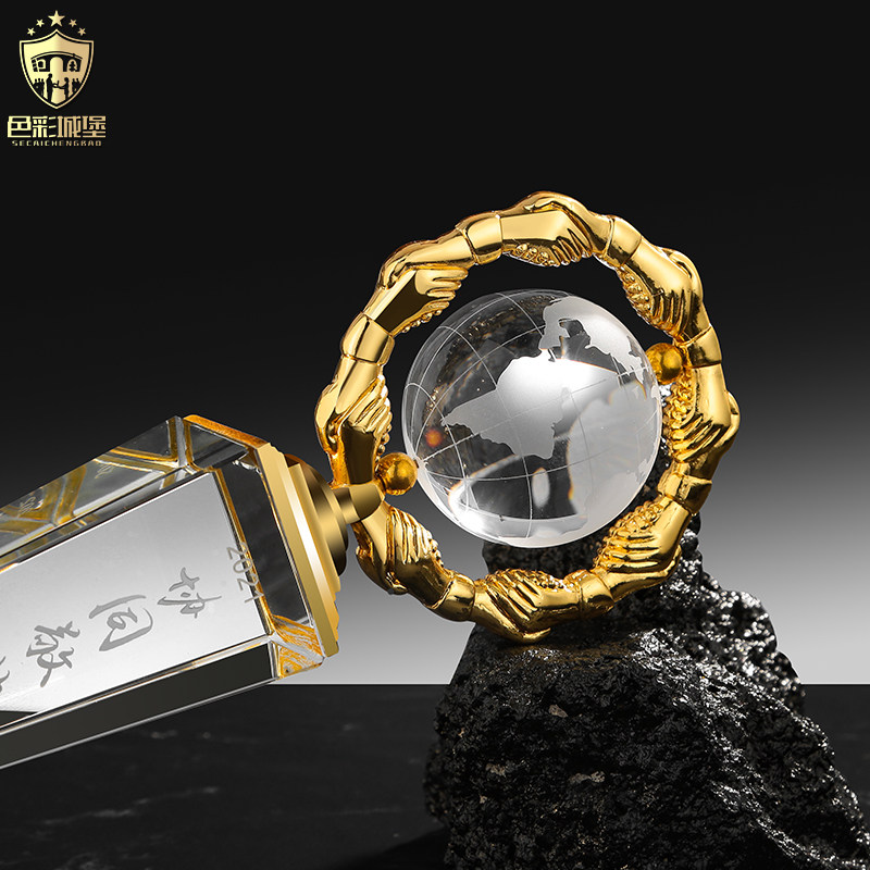 New crystal trophy custom creative metal cooperation win-win handshake cooperation win win team Award Crystal Globe