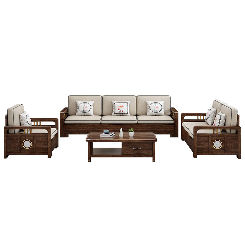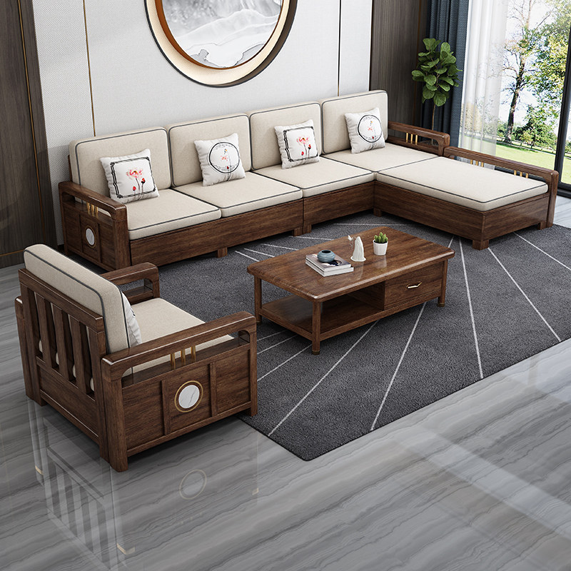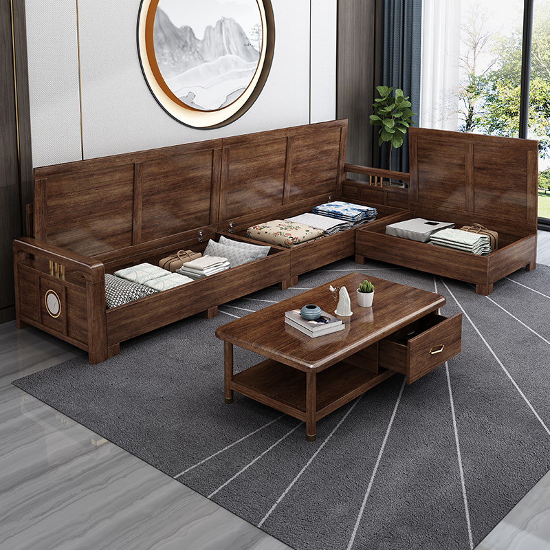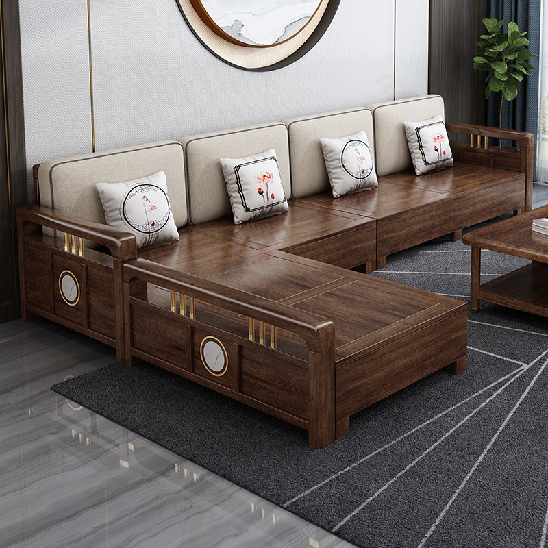 New Chinese style solid wood sofa combination wooden living room winter and summer dual-use large apartment with chaise walnut furniture set
