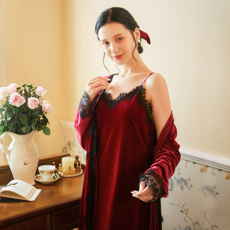 High-end long sleeve gold velvet sleeping robe in two style suit women's autumn and winter sexy harnesses sleeping skirts palace windfall pyjamas home clothes