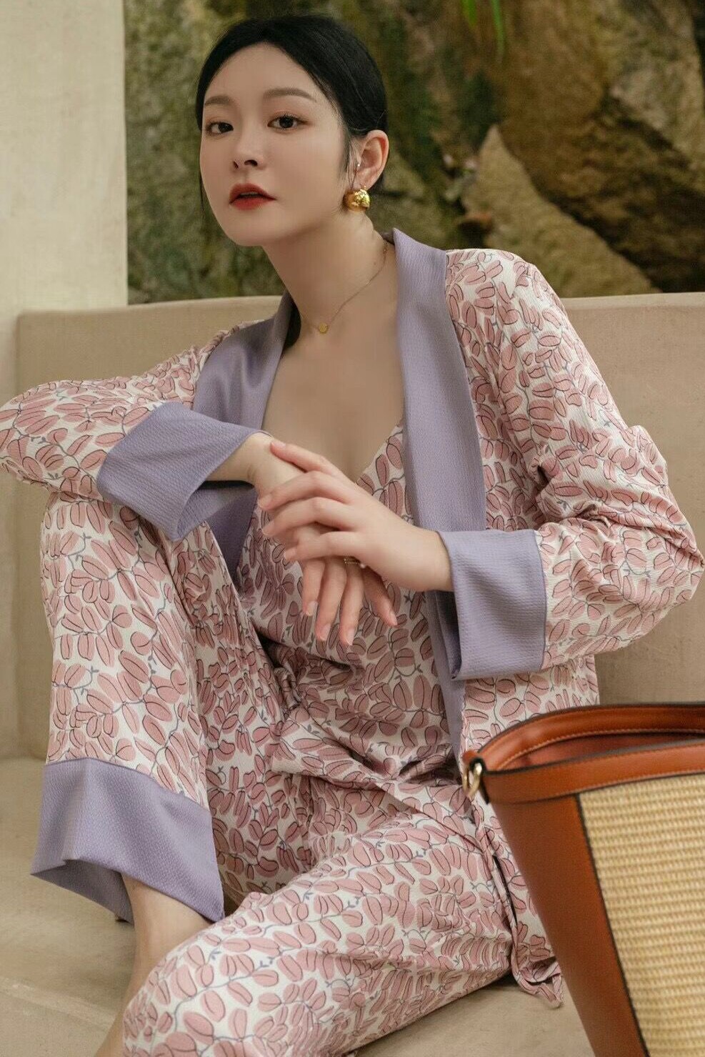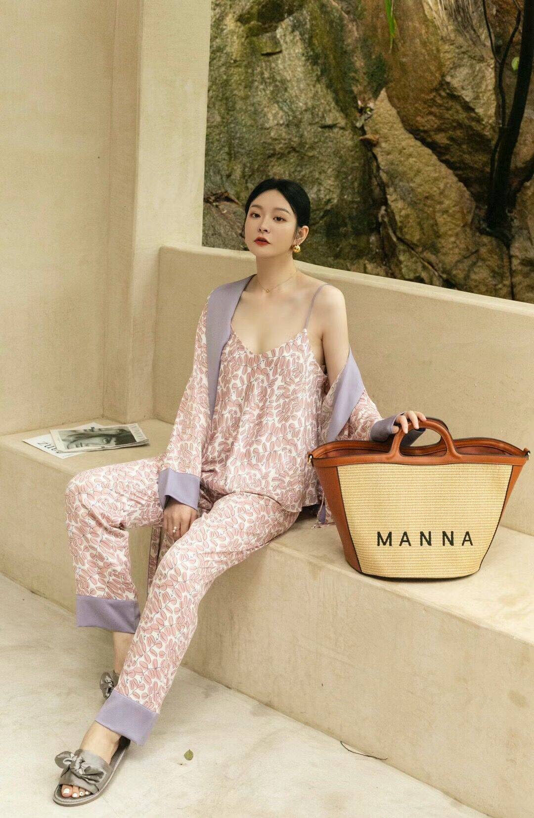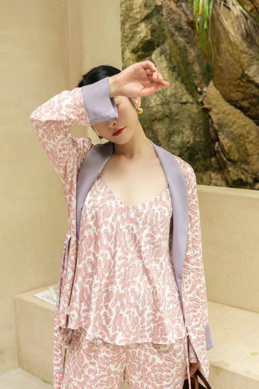 Soft Touch style ~ White Fumei both view high-end pyjamas women's autumn real silk national wind clover leaves three suits