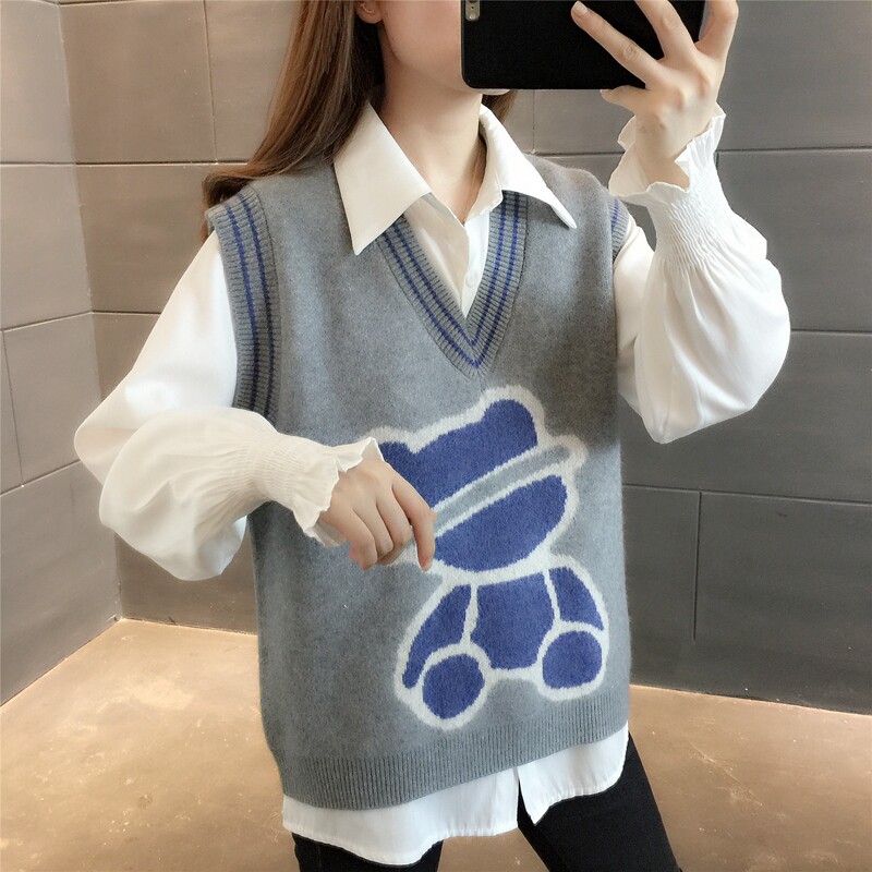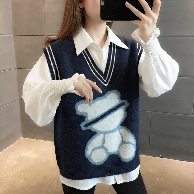 College Wind Small Bear Knit Waistcoat Women's Autumn 2021 New Korean Version Loose With Small Vest Stack Wearing Short sweater