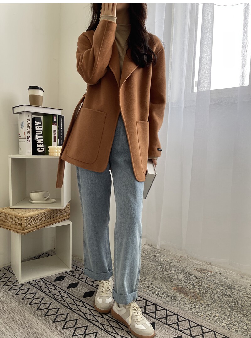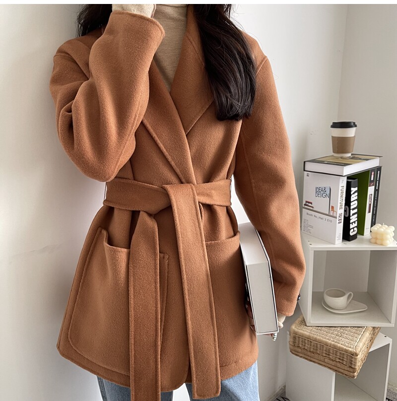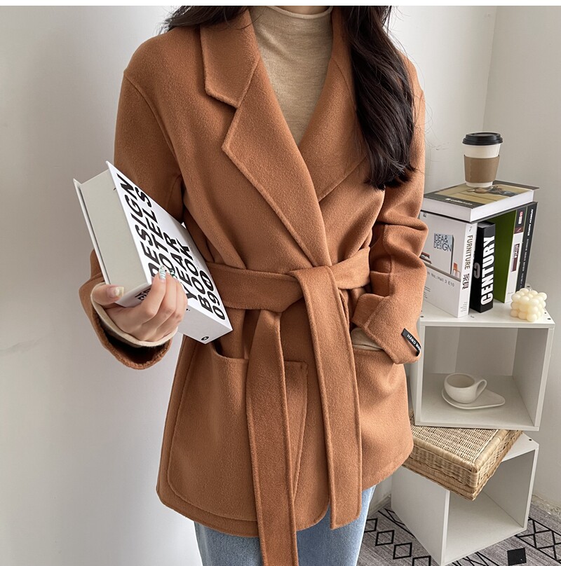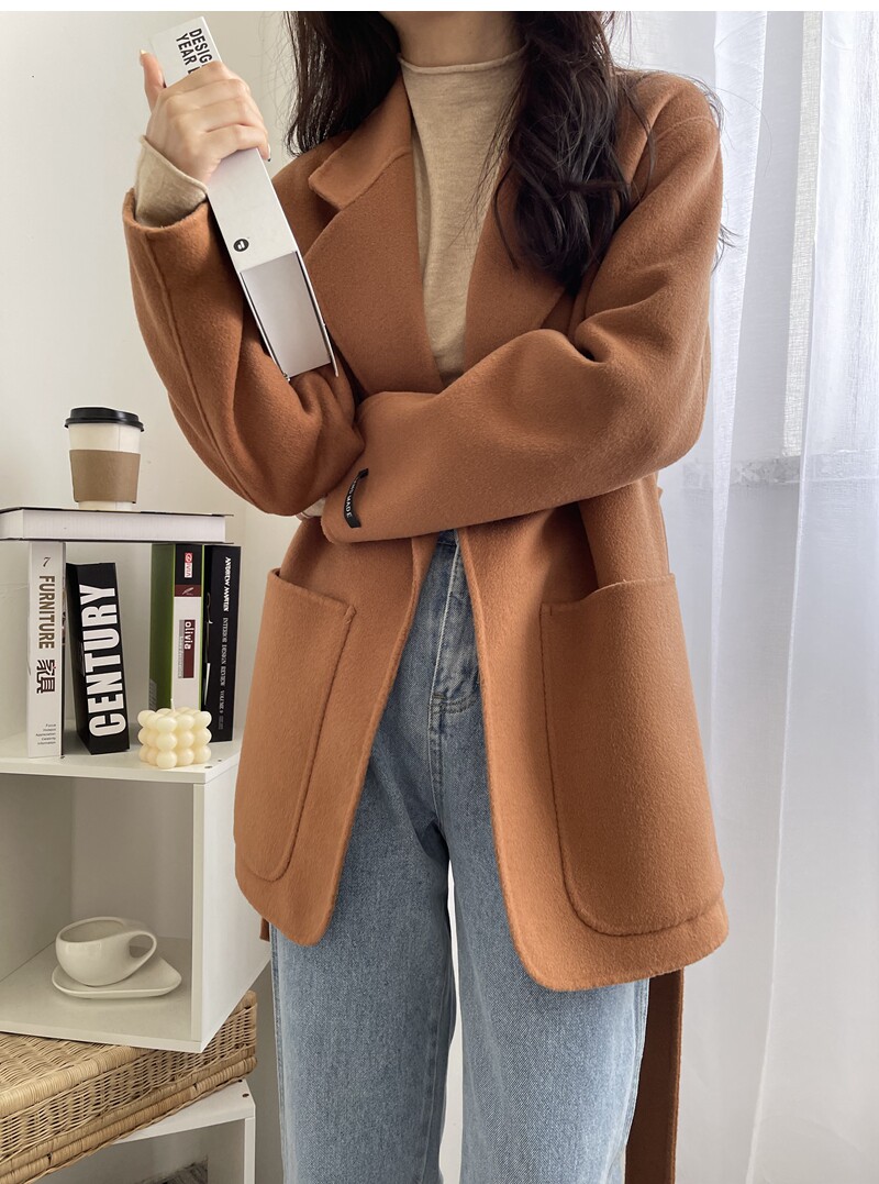 Short double face cashmere big coat woman 2021 new Korean version long sleeve orange red lace double face fur coat