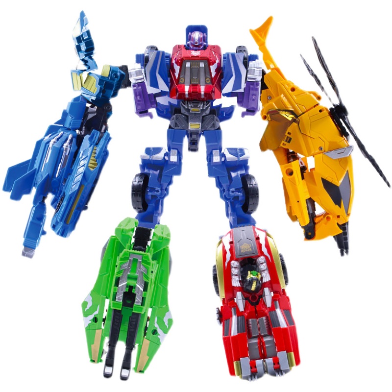 Five-in-one car robot aerial chopping axe robot (yellow) land armor flame robot (red) Genesis Thunder robot (blue) steel armored battle gun robot (green) Hurricane battleship robot (blue)