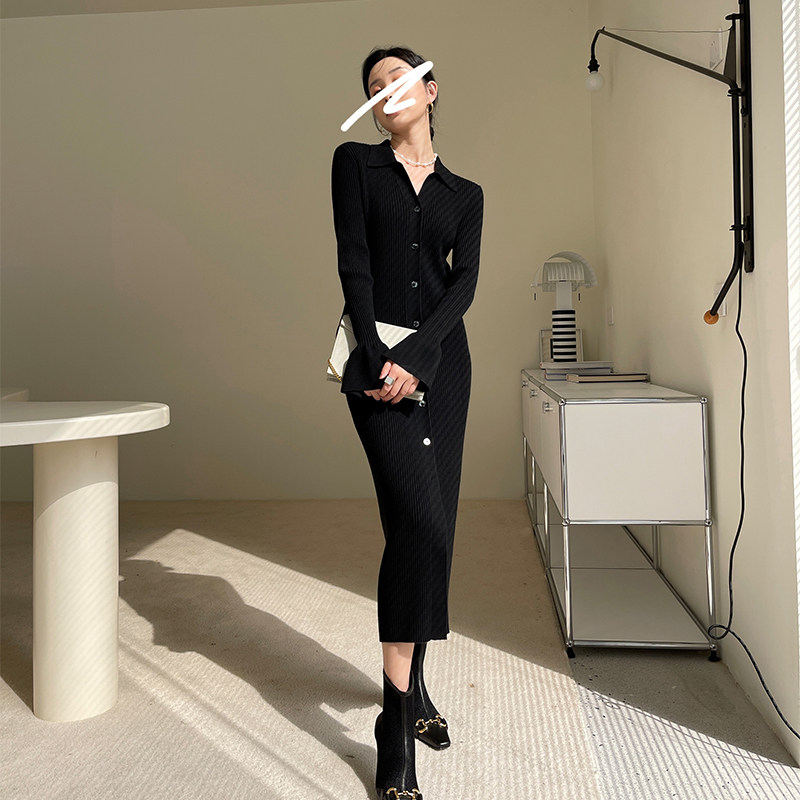 Right Back Shirt Collar Lapel Flare Sleeve Knit Cardigan High Waist Slim Mid Length Dress Women Autumn