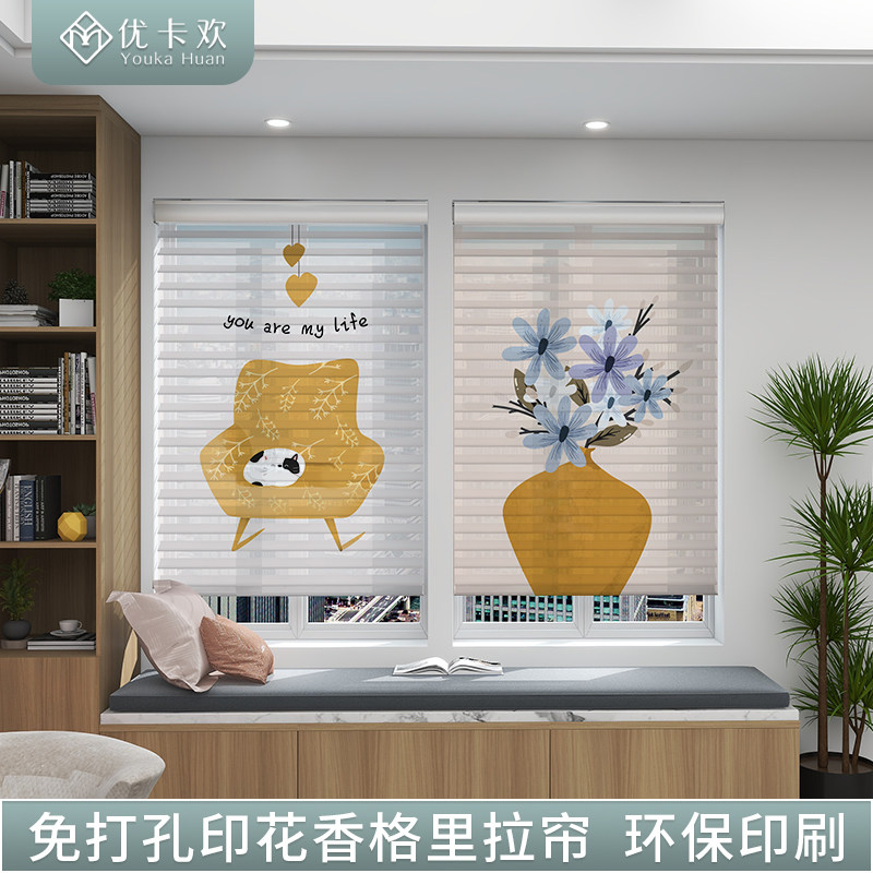 Printed Shangri-La curtain double-layer blackout blinds soft gauze curtain punch-free dressing room kitchen hand-pull lift