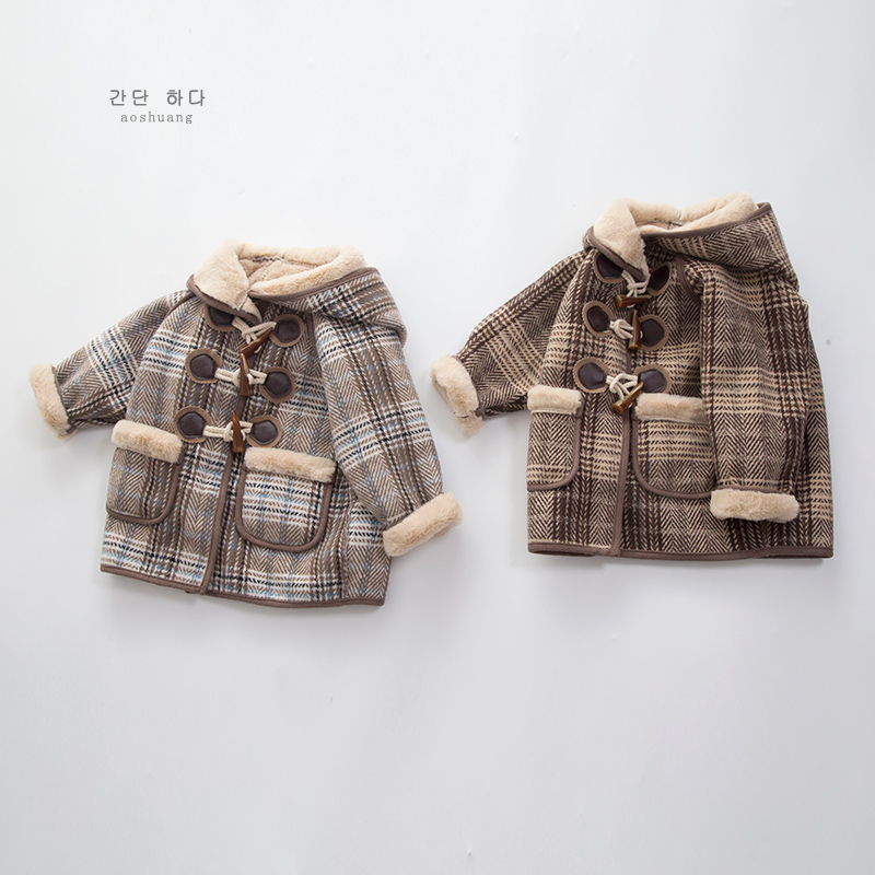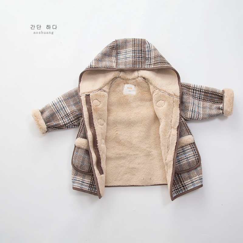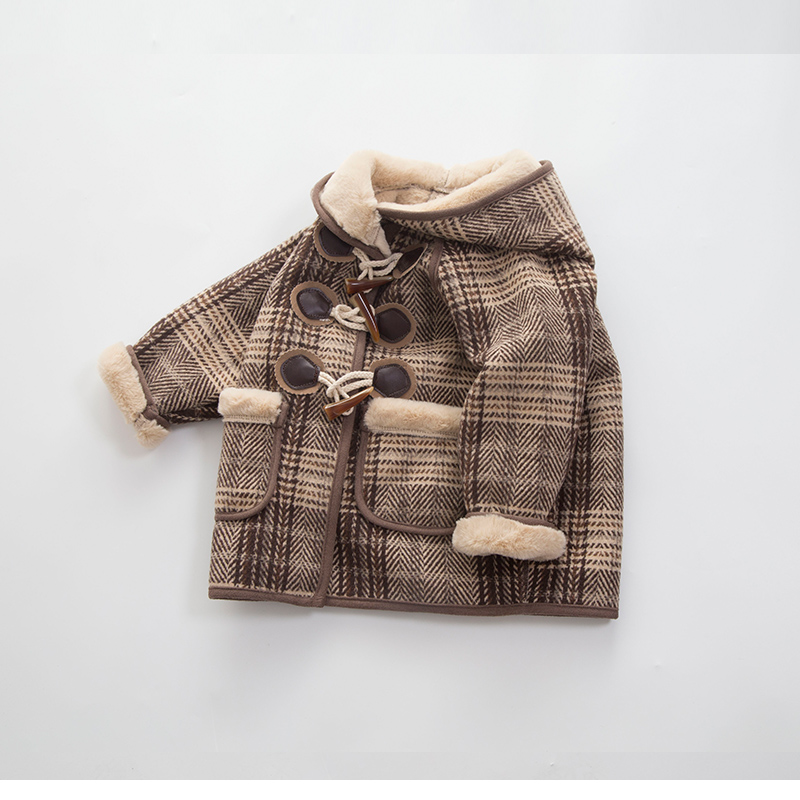 Children's woolen 2021 winter plaid long hooded coat plus velvet thickened boy's fur all-in-one woolen coat