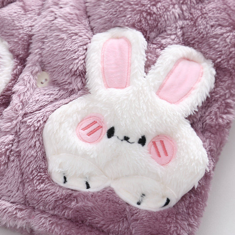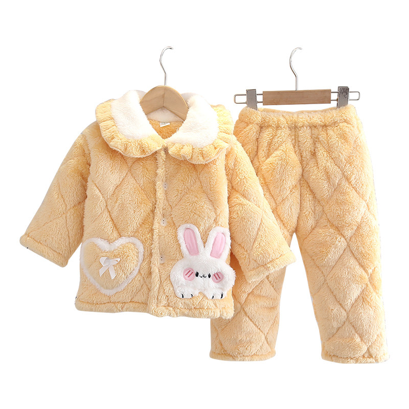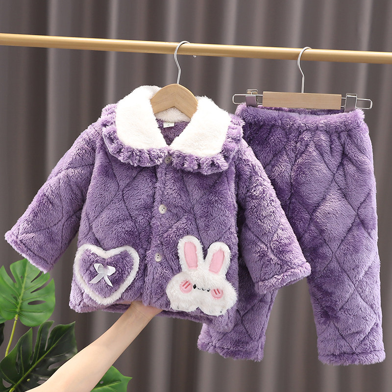 Children's pajamas girls winter big children's flannel three-layer quilted plus velvet thick coral fleece girls home clothes