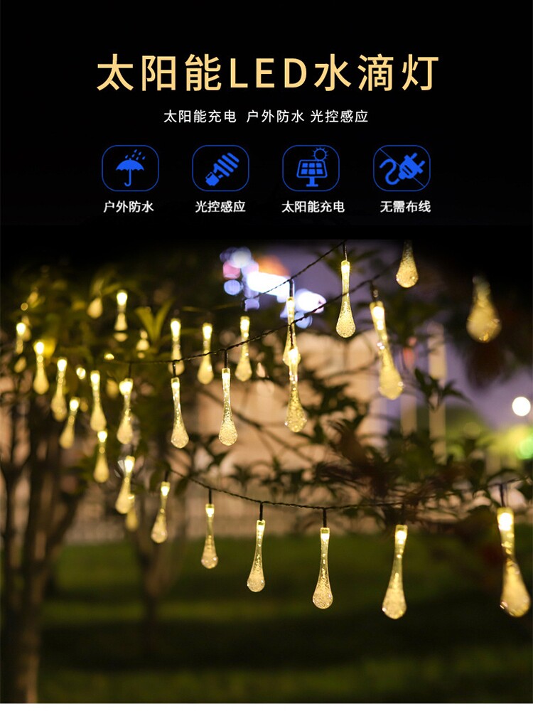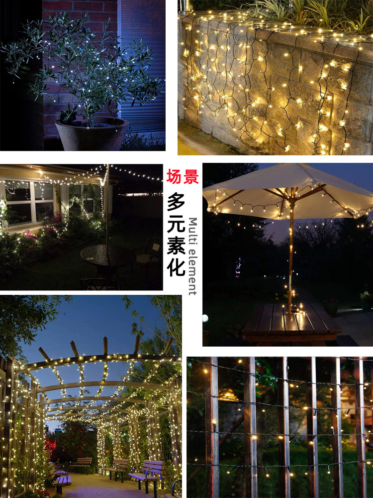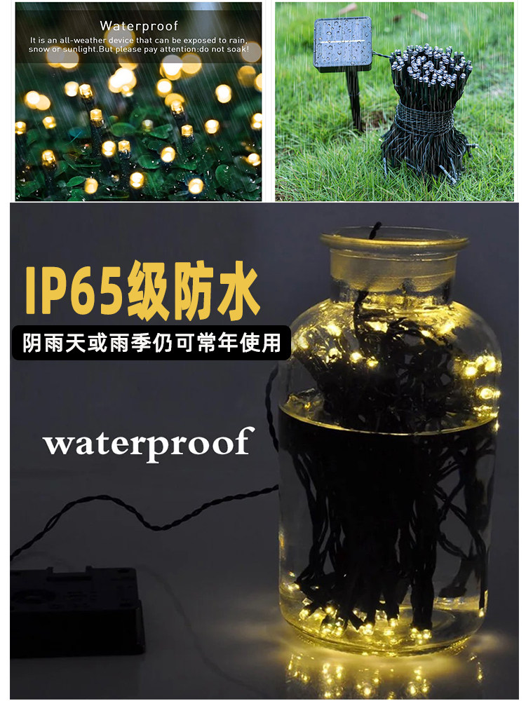 7 meters 50 lights - small solar panels can not be charged 10 meters 100 lights - dual-purpose charging solar panels 20 meters 200 lights - dual-purpose charging solar panels 30 meters 300 lights - dual-purpose charging