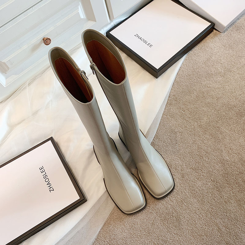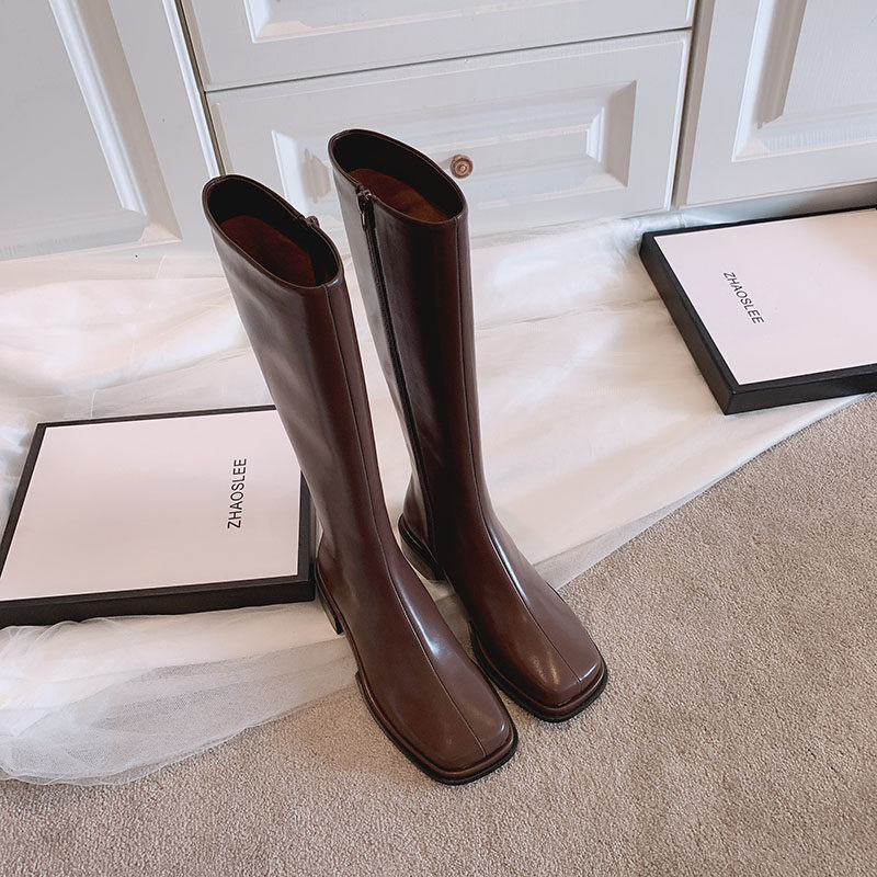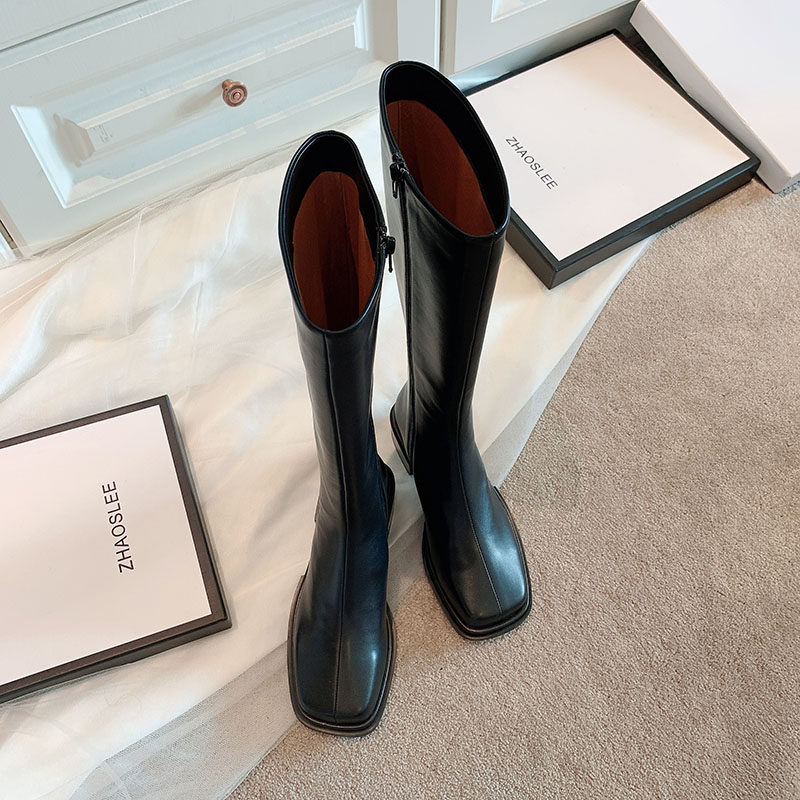 2021 fall new square headlong boots woman heel side pull chain long cylinder riding boot heel slim skinny boots high cylinder boots