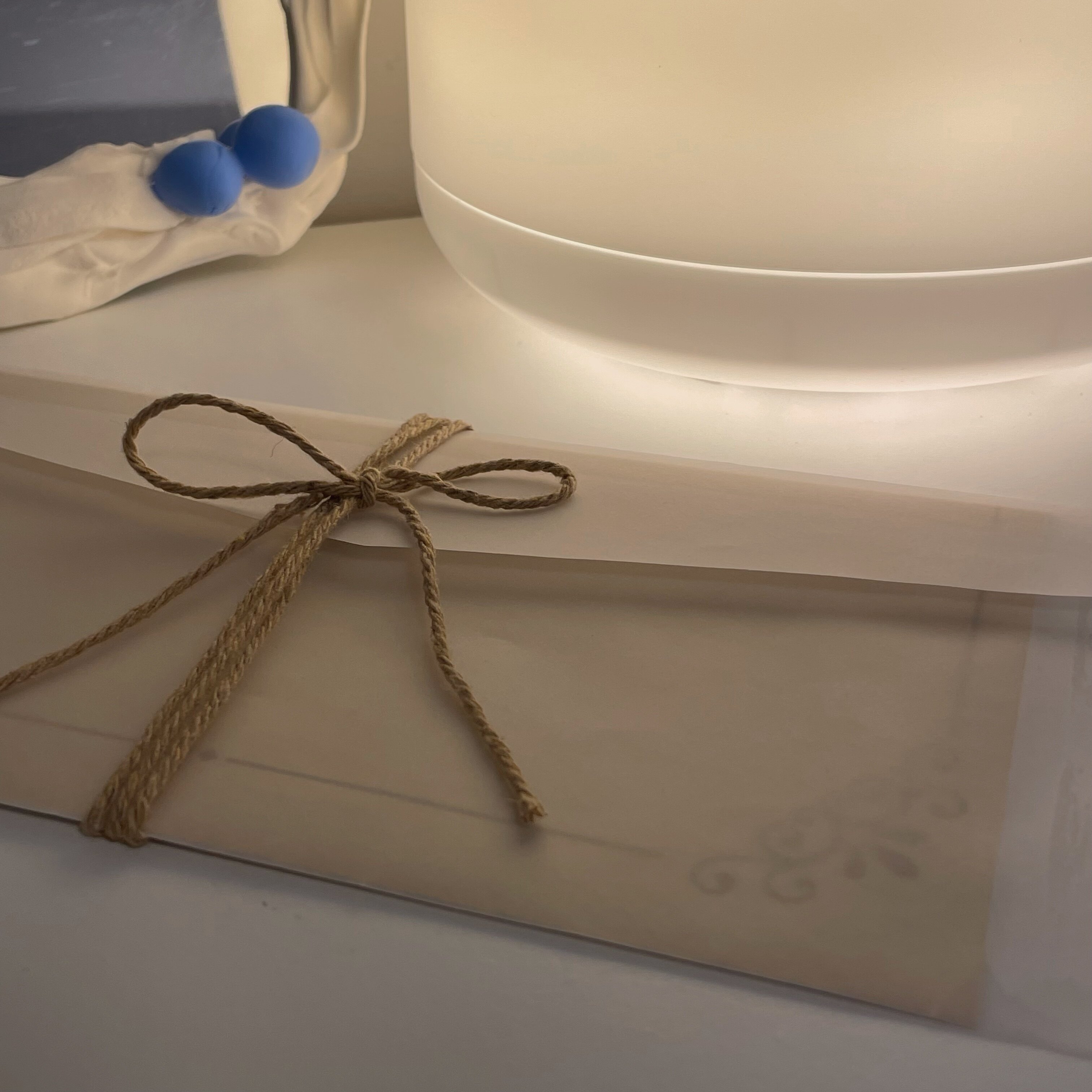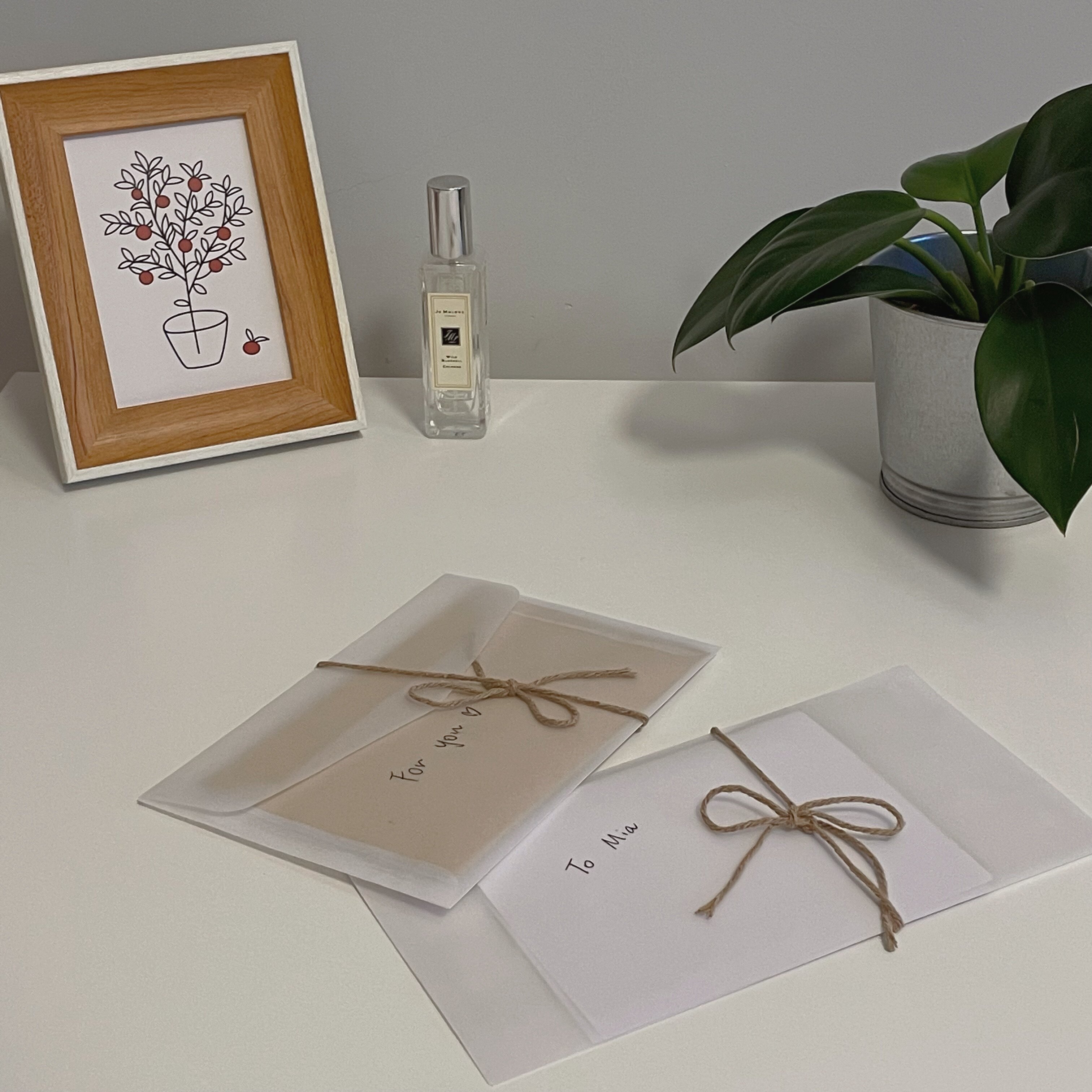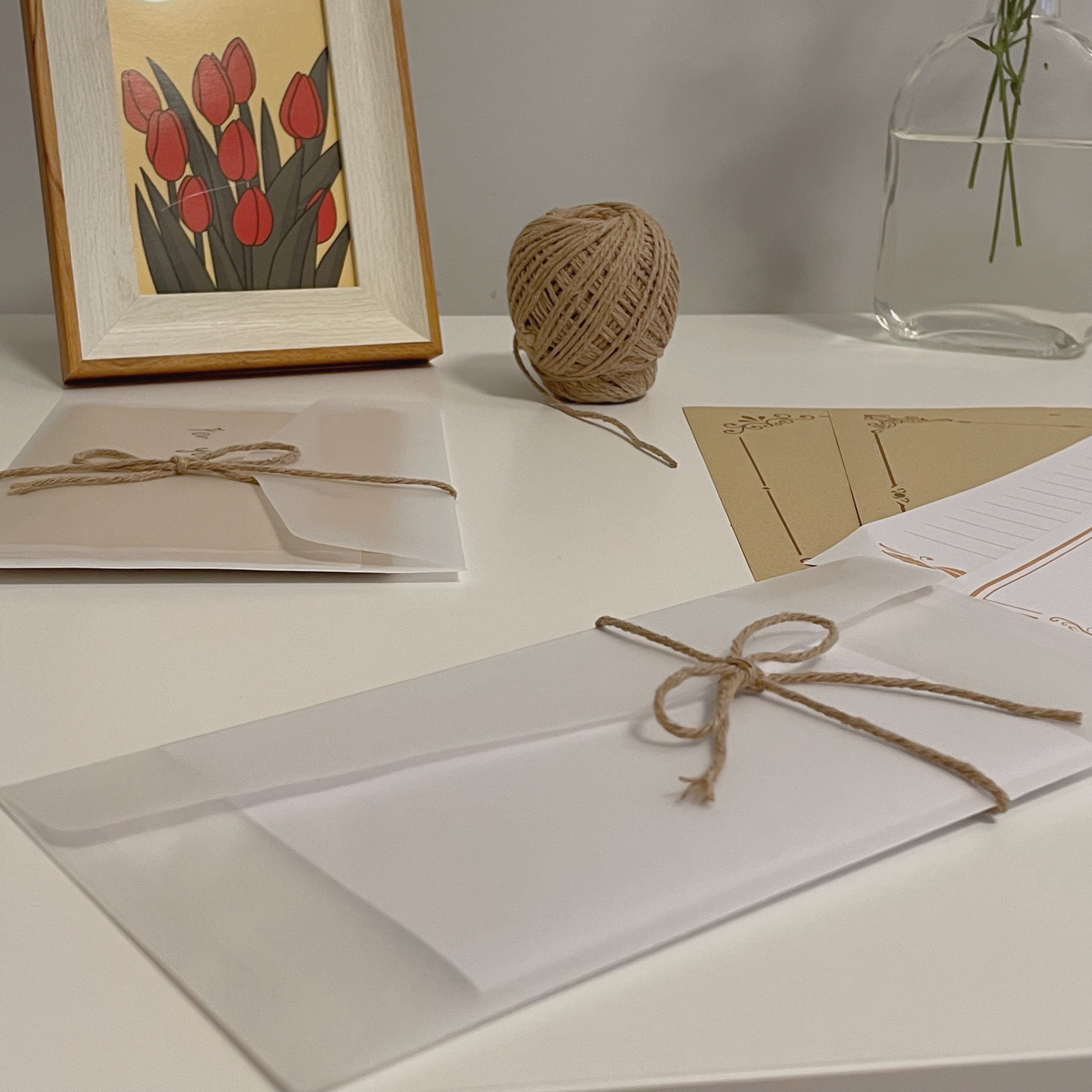 5 sulfuric acid paper envelopes, 5 short envelopes, 5 white letter paper sulfuric acid paper envelopes, 5 long envelopes, 5 kraft letter paper sulfuric acid paper envelopes, 5 long envelopes and 5 short envelopes, a beige roll with rope
