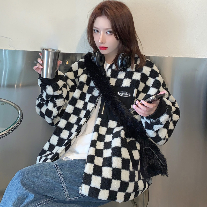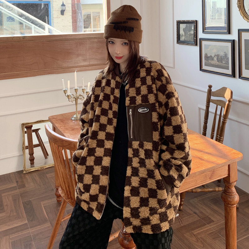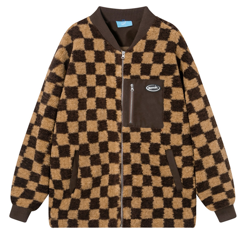 NEIGBORL tide brand checkerboard sheep curly coat men's autumn and winter all-match baseball collar plus velvet thickening couple cotton clothes
