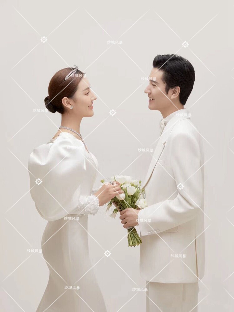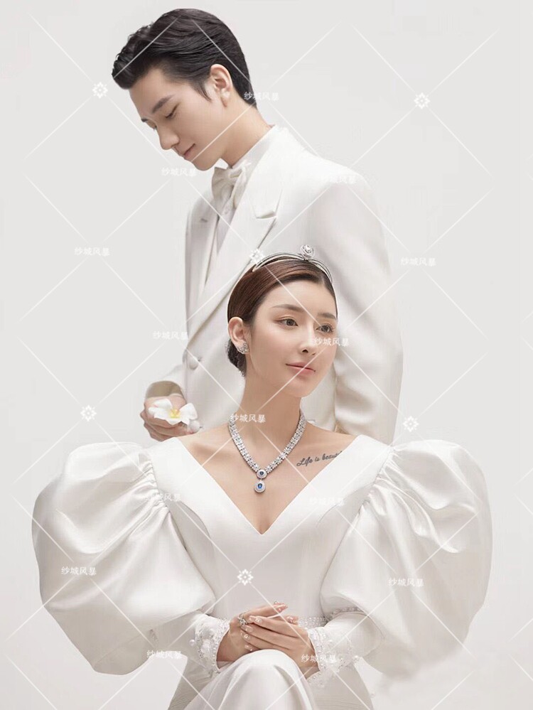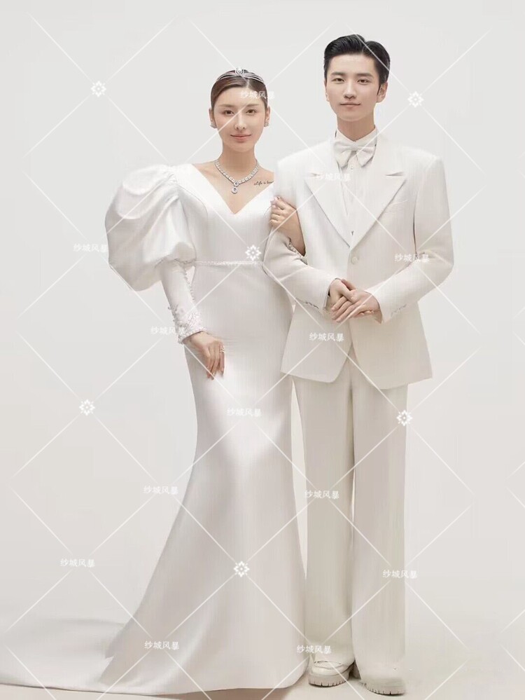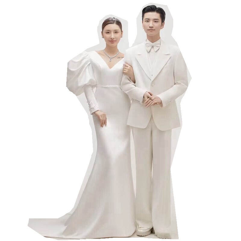 2021 Photo Studio Photo Theme Costume Couple Slim Large Backless Long-sleeved Dress Inner Scene White Satin Mermaid Wedding Dress