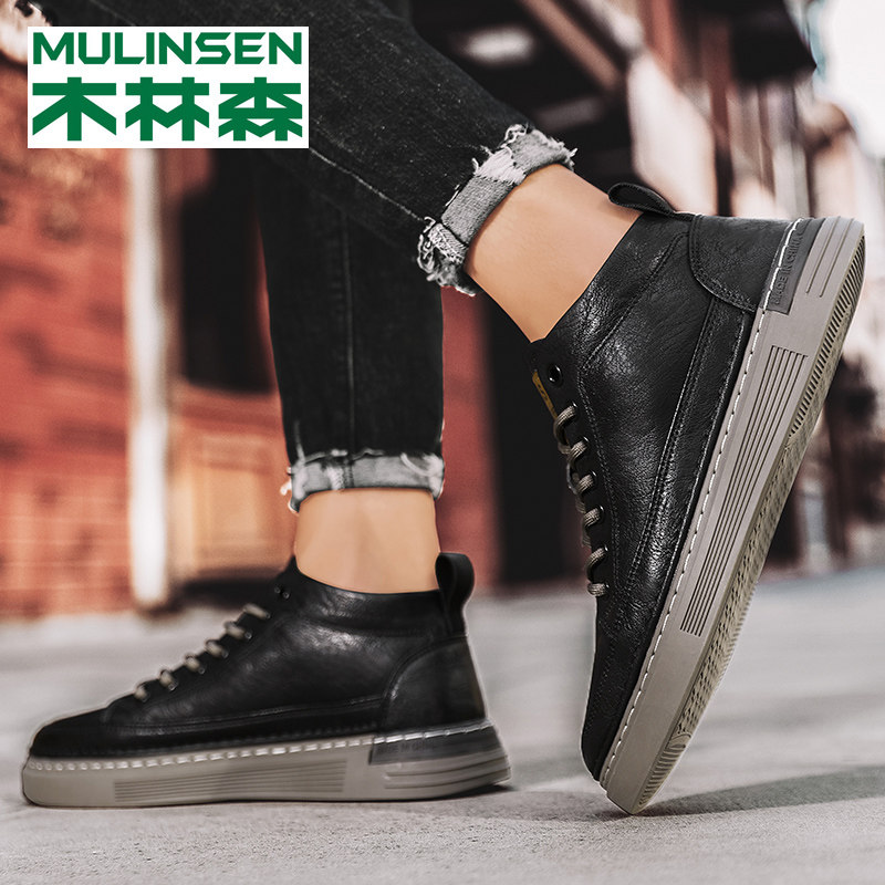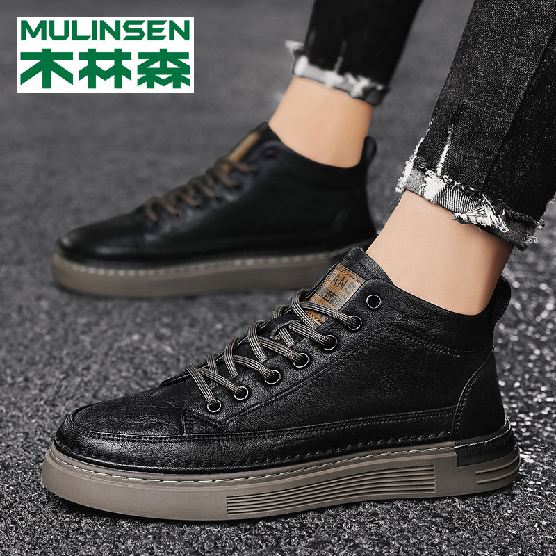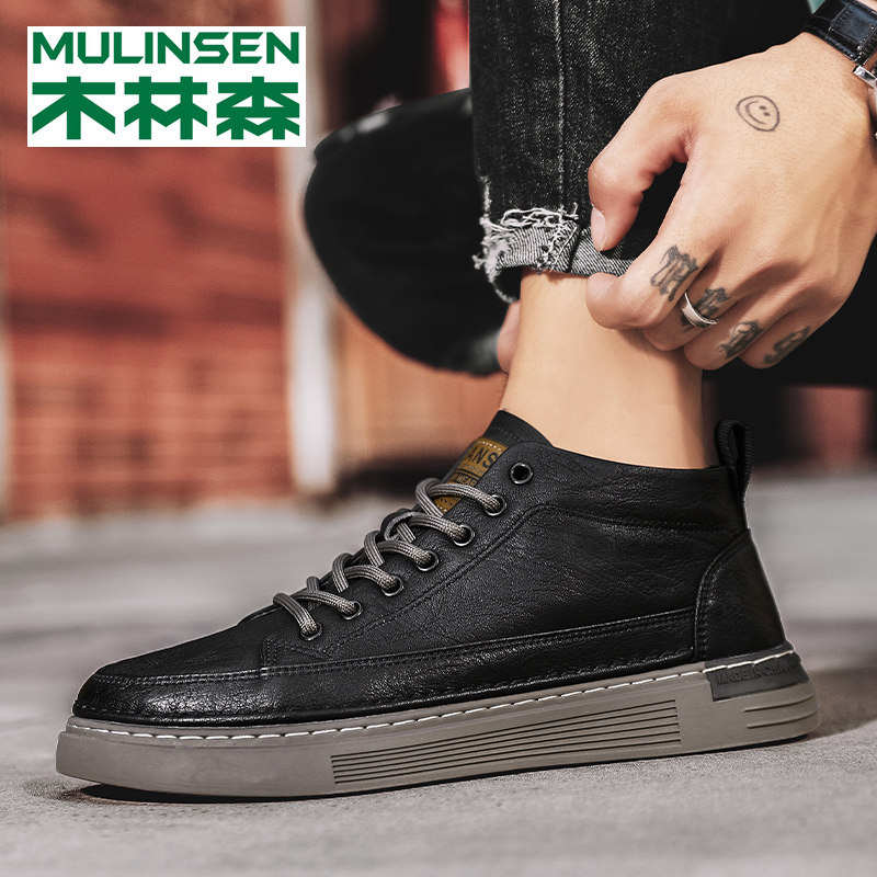 Mulinsen high-top men's shoes winter plus velvet warm cotton shoes mid-tube skate shoes trend autumn casual leather shoes men's trendy shoes