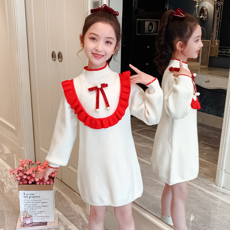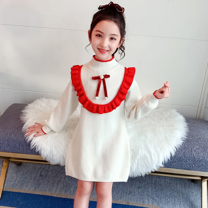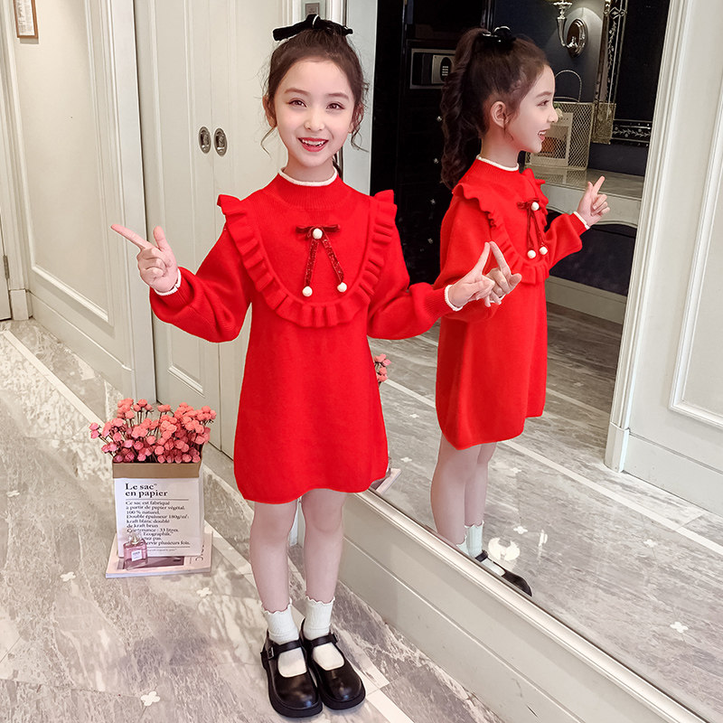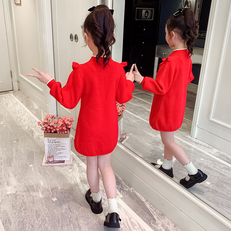 Girls autumn and winter red sweater skirt children's half-high collar thickened knitted skirt Western style girls wear a dress