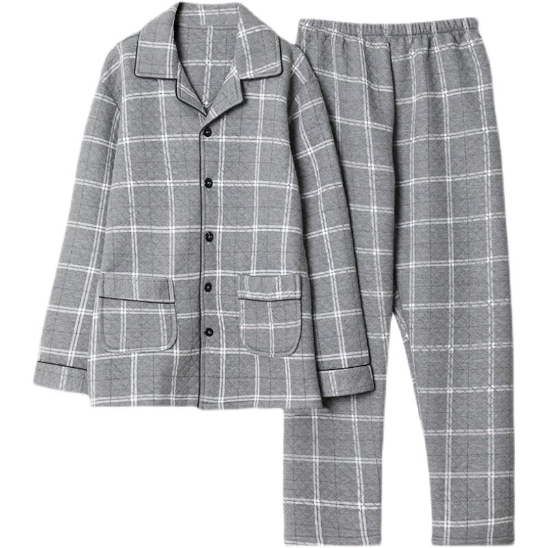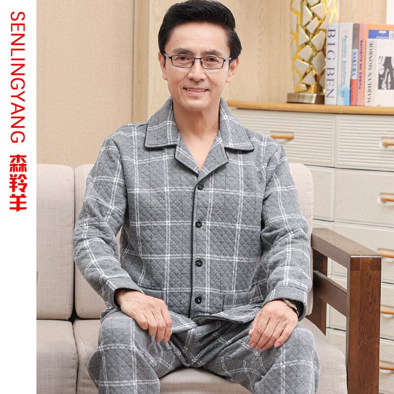 Middle Aged Pyjamas Men's Autumn Winter Long Sleeves Pure Cotton Thickened Mezzanine Slim Clip Cotton Air Cotton Dad's Home Suit Suit-Taobao