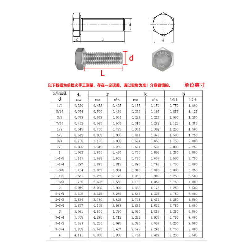 Anglo-American 304 stainless steel external hexagonal bolt lengthening screw screw screw 1 4 5 16 3 8 7 16 1 2