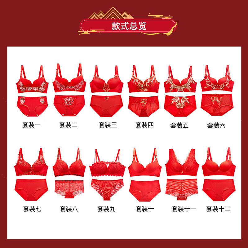 Big red sexy underwear set female wedding bride lace bra natal year no steel ring gathered small chest bra