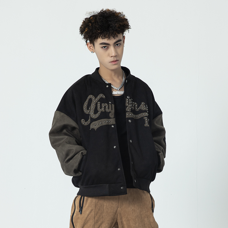 New Factor Tide Card Autumn Winter Suede Suede Splice Crash Color Jacket Jacket Nail Drill Embroidered LOGO Baseball Uniform for both men and women