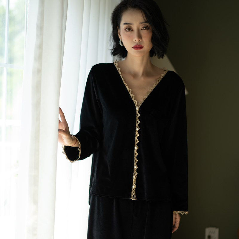 Gentle and elegant ~ luxury niche design gold velvet pajamas women's autumn and winter black can wear sexy home clothes