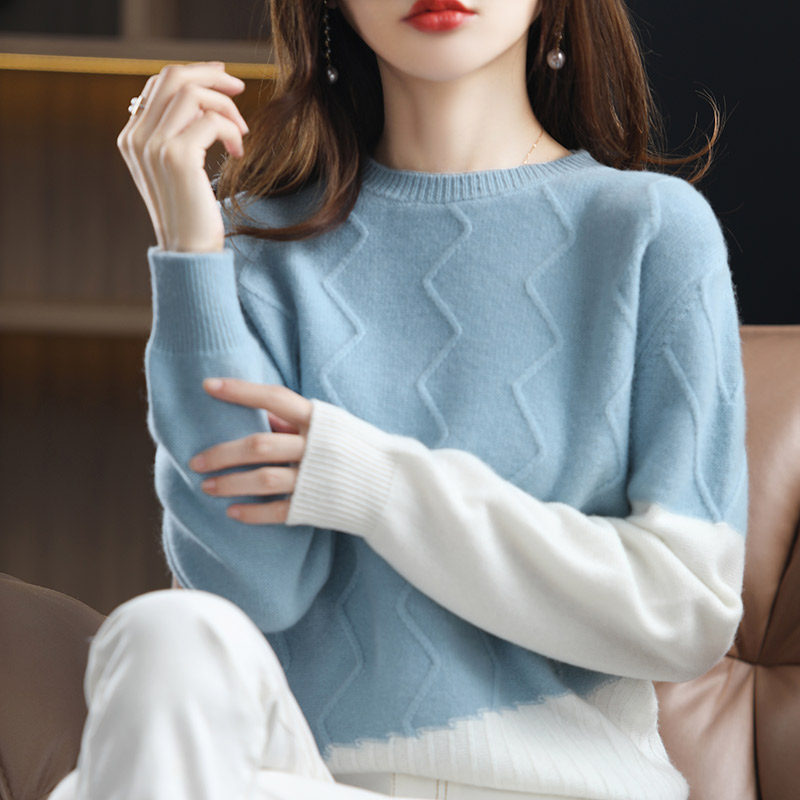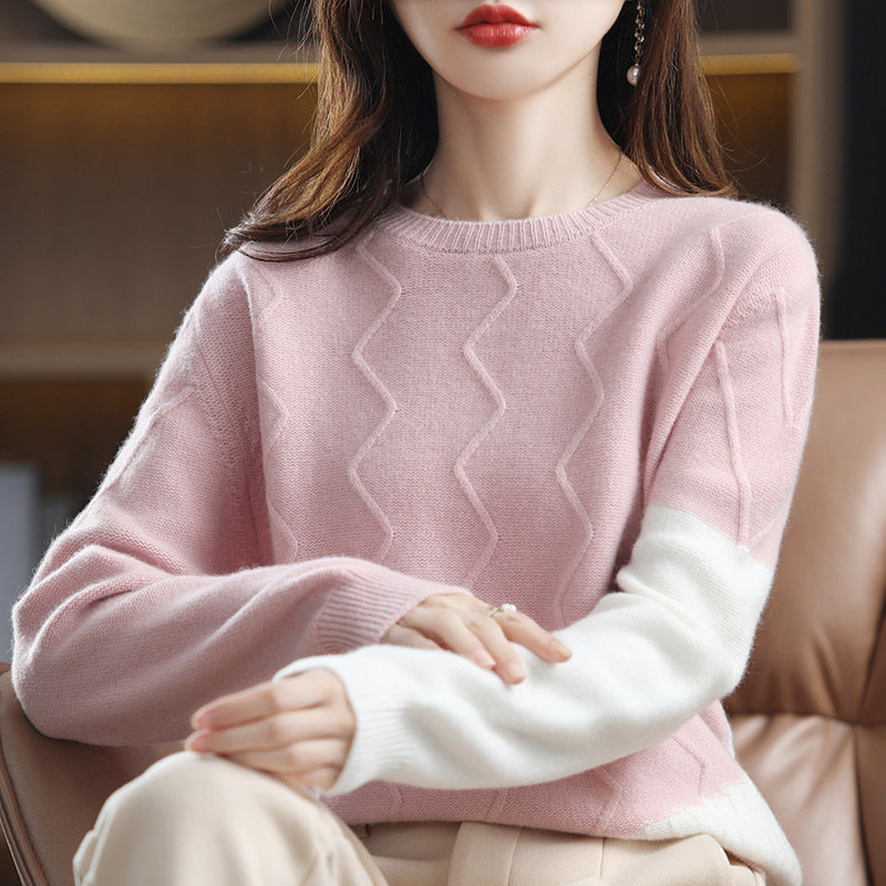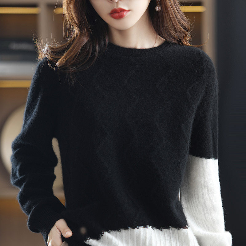 Amazing time 2022 autumn and winter new wool round neck color blocking sweater loose and lazy knitted bottoming shirt