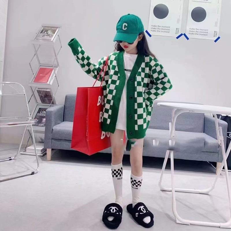 Korean children's clothing boys and girls sweater 21 autumn and winter new children's checkerboard plaid jacket in the big children's knitted cardigan tide