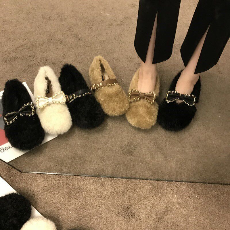 ITSK plush shoes women's winter outer wear plus velvet bow one-step Peas shoes