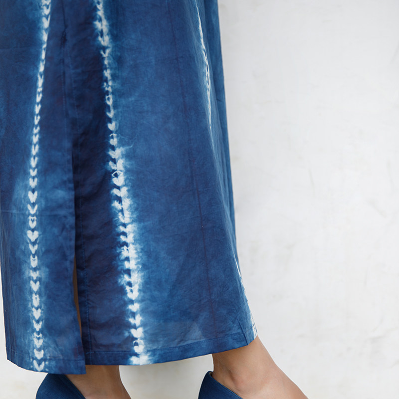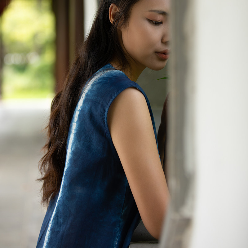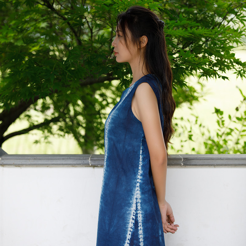Our native ancient law blue dye handdyed pure cotton fuchsia silk striped sleeveless dress with long dresses head round neck