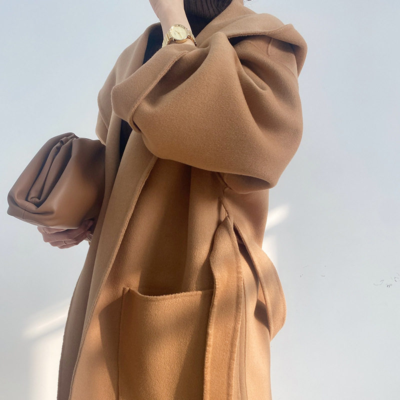 Maje Koce double-faced cashmere coat women's rose red high-end hooded lace-up mid-length wool woolen coat - Taobao